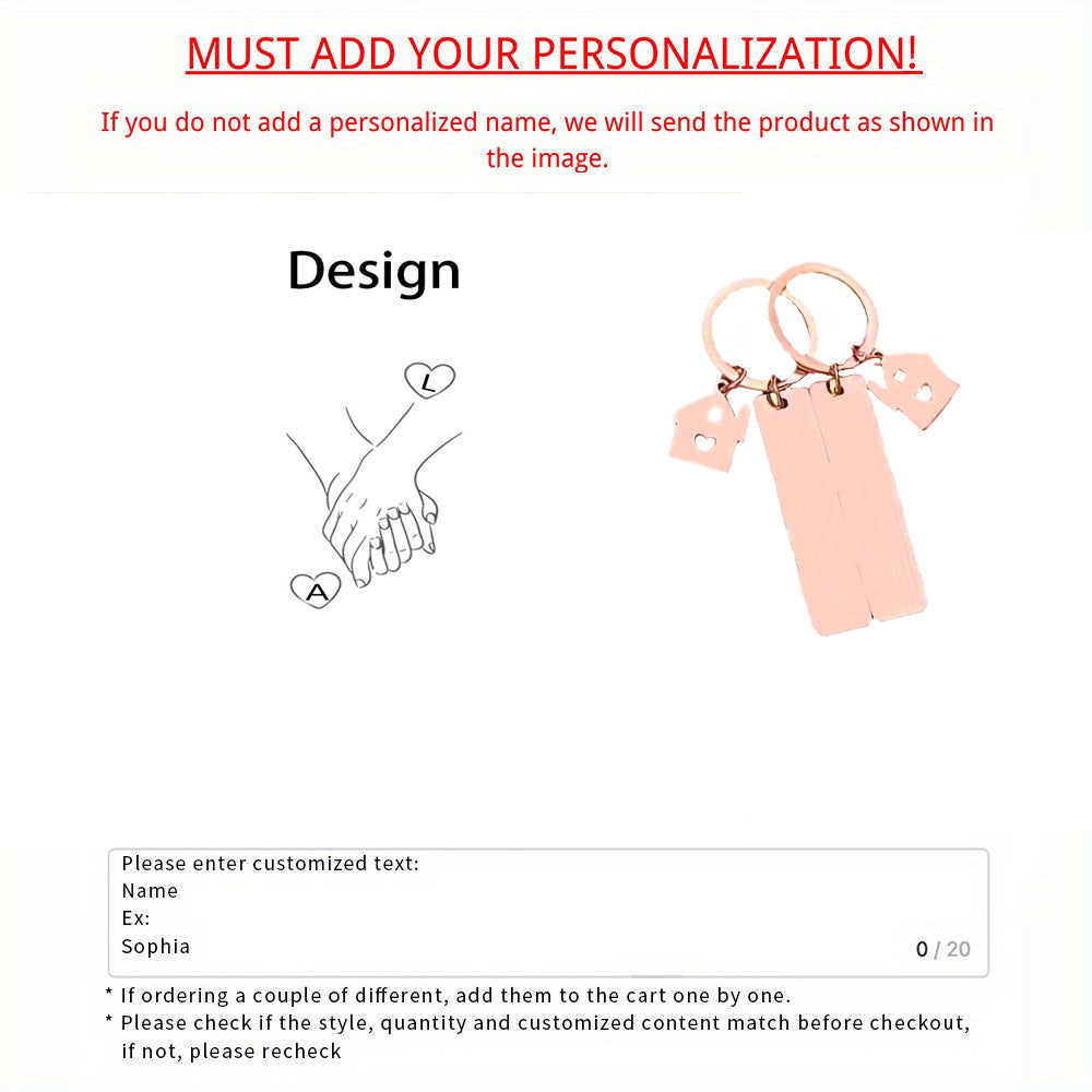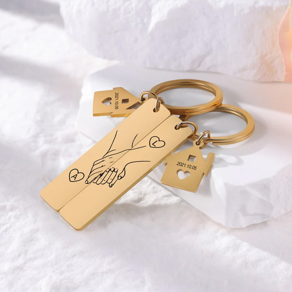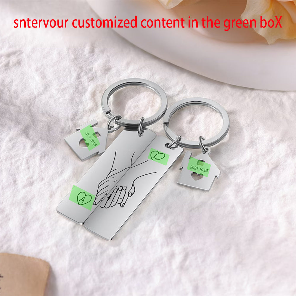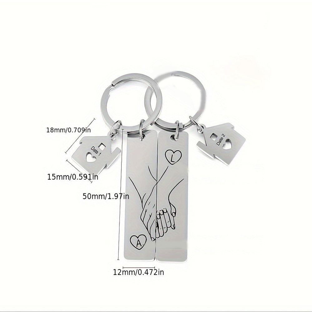This set of 2 stainless steel keychains features romantic holding hands with heart and infinity symbols, perfect for couples, newlyweds, or as an anniversary gift.