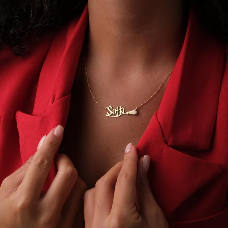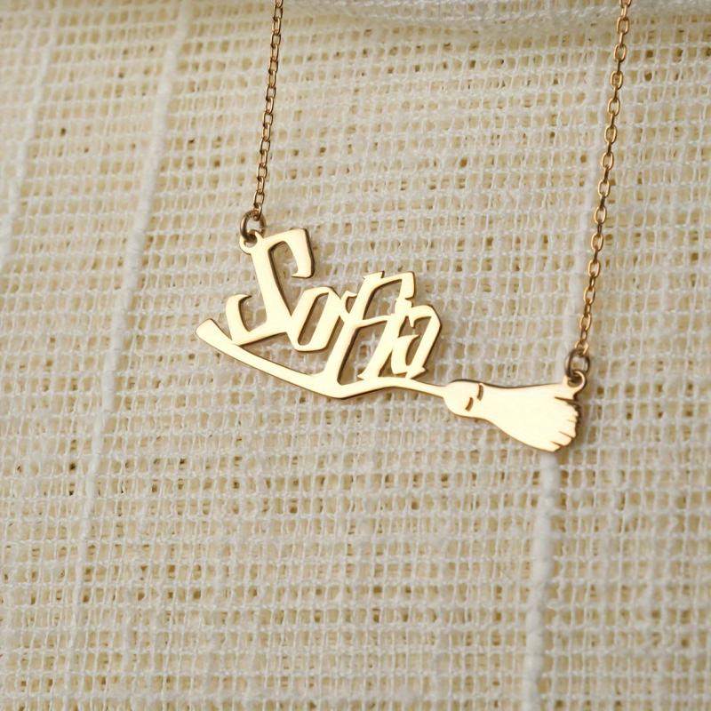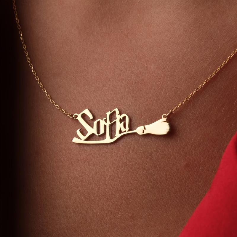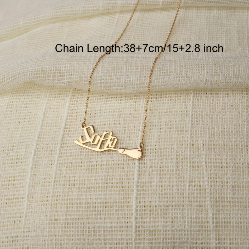 Get your own personalized magic broom necklace with English lettering, perfect for witches and wizards. Made of durable stainless steel.