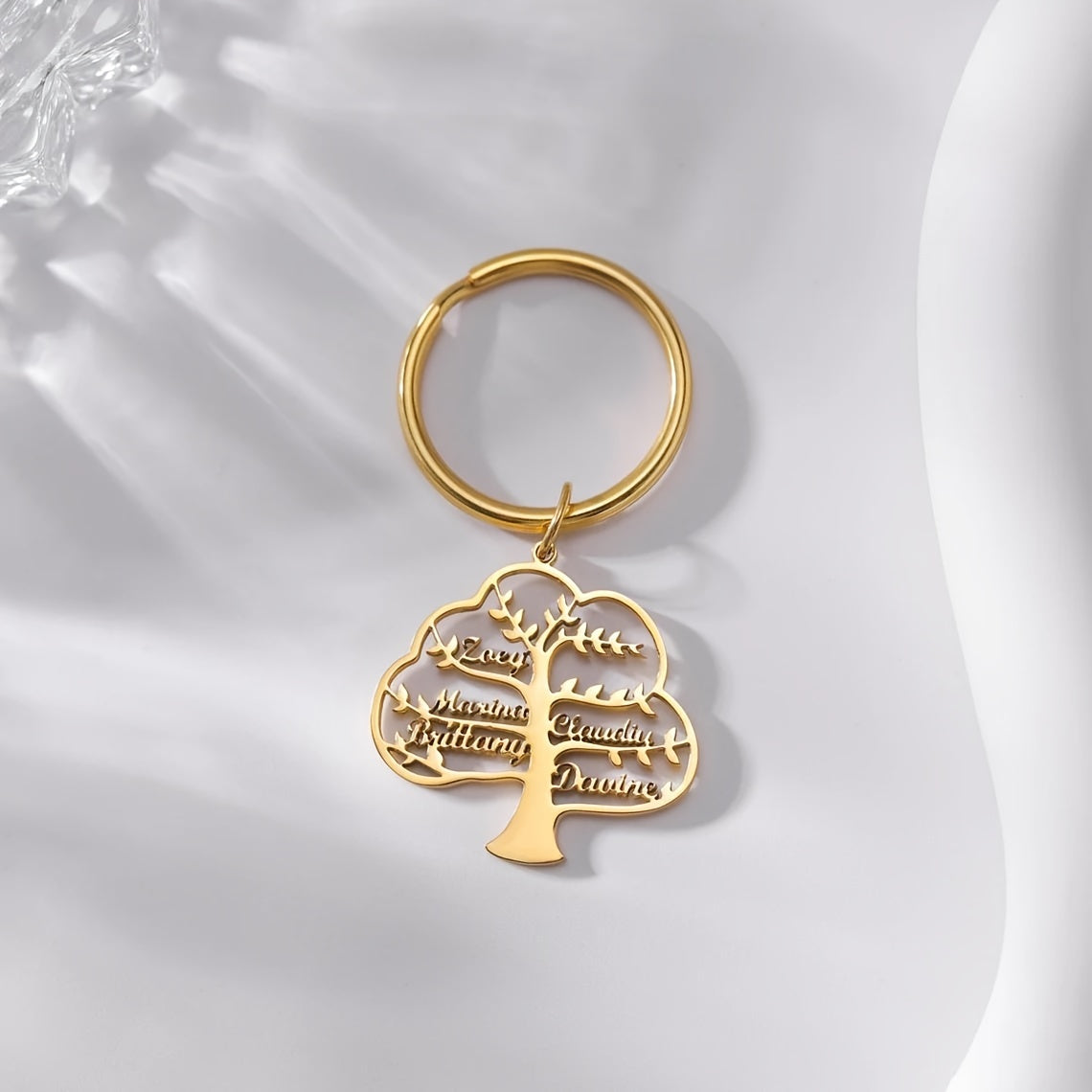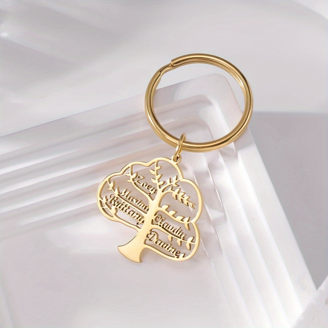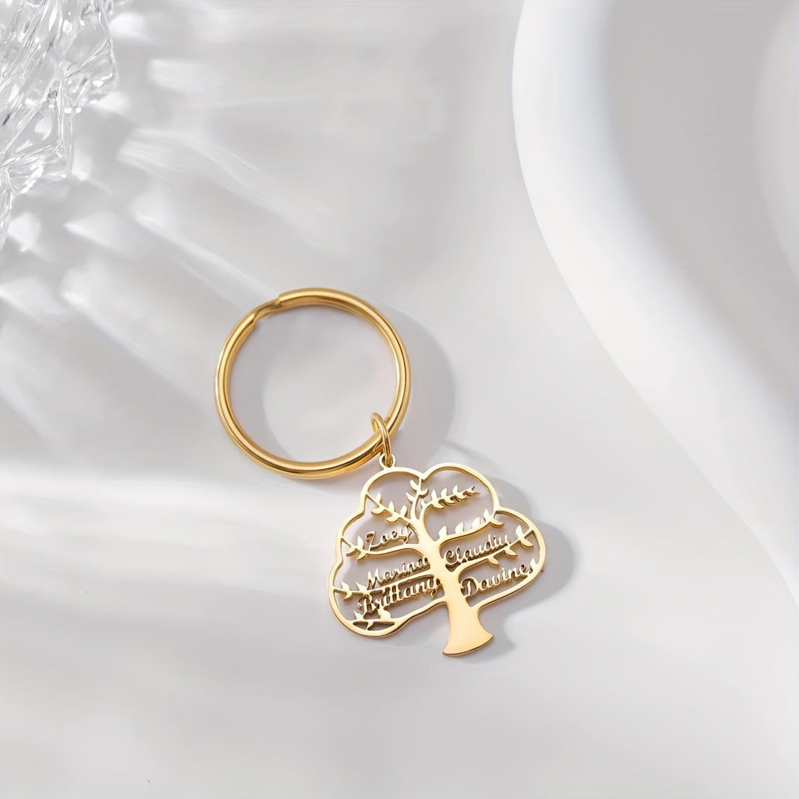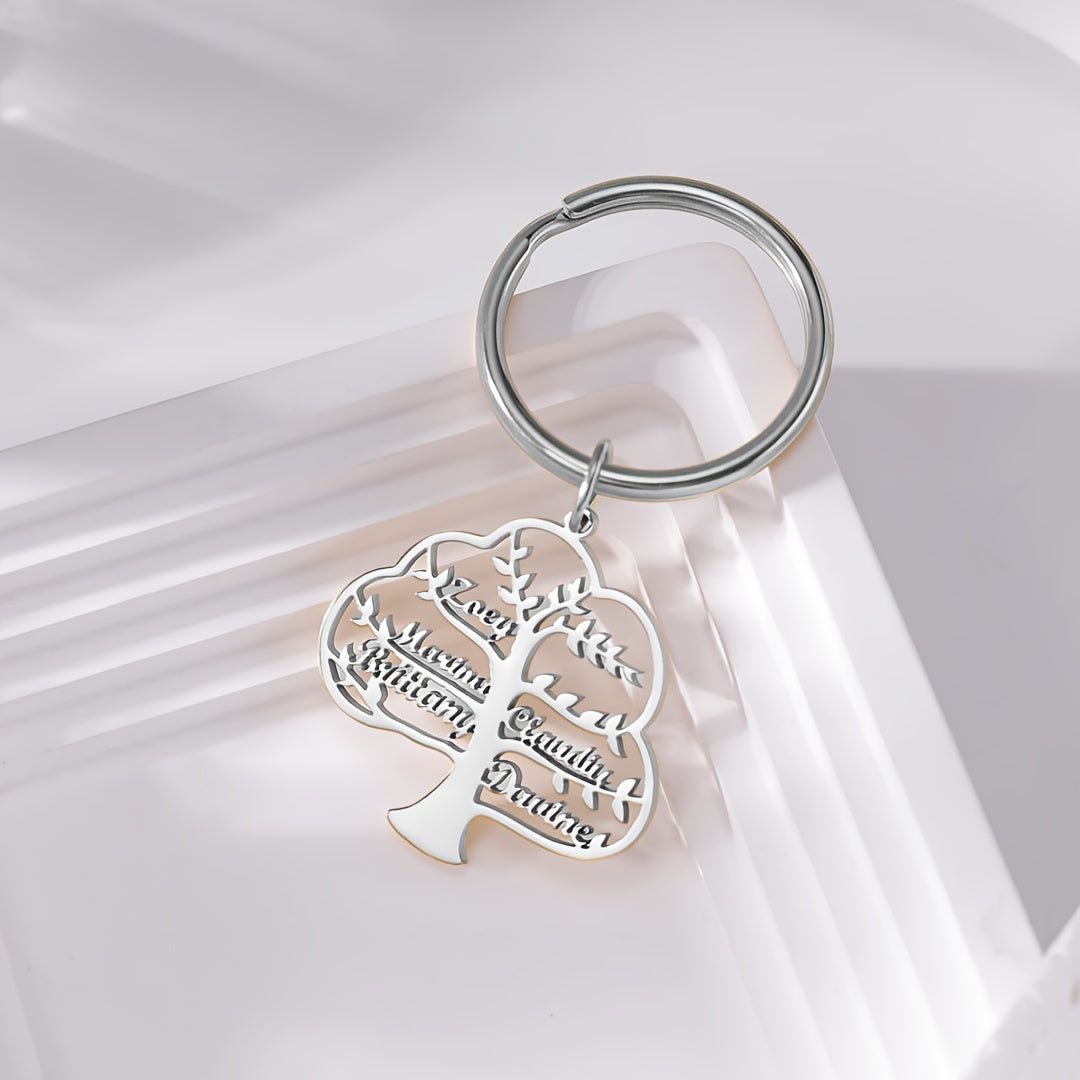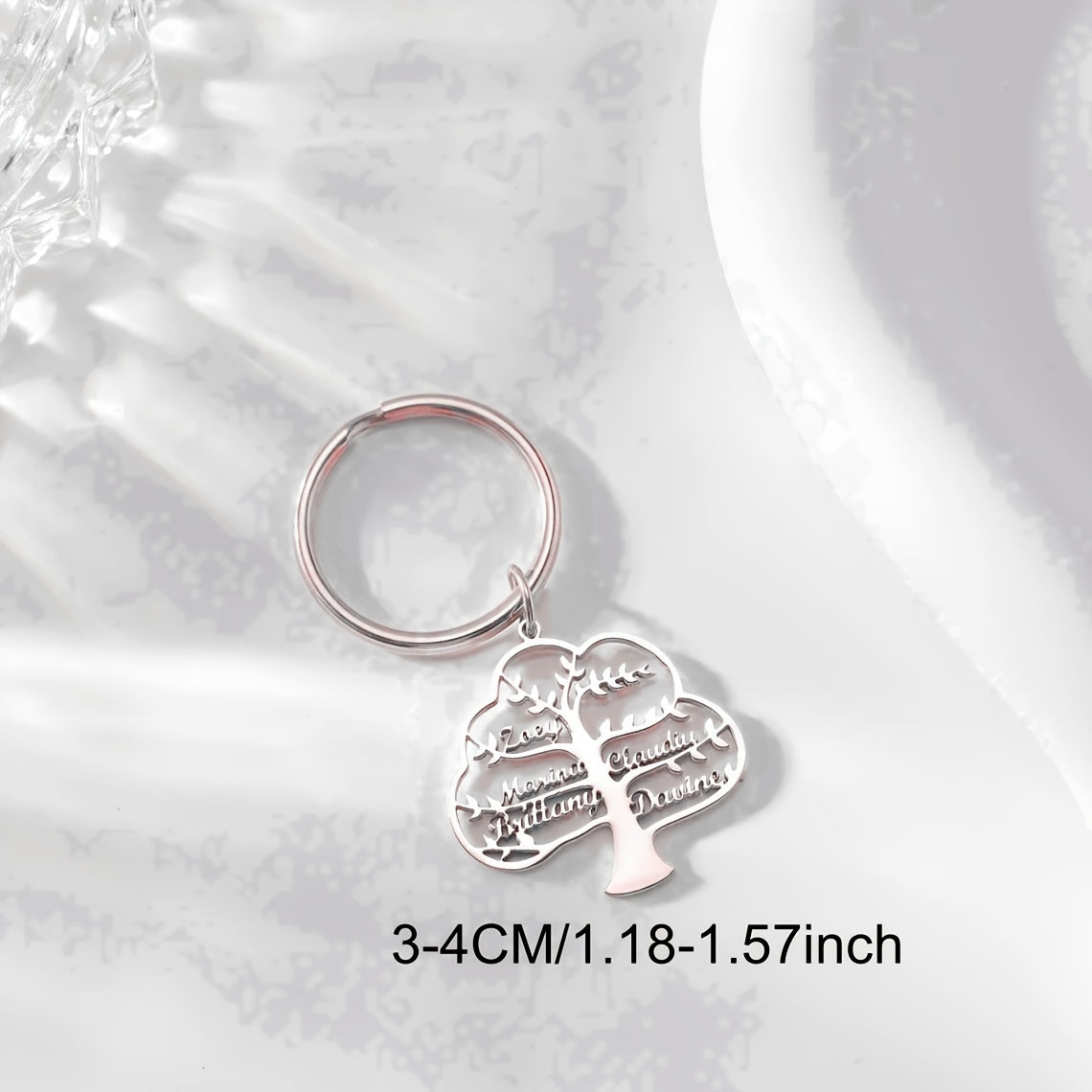 Keep your keys organized and stylish with this personalized stainless steel keychain featuring your custom name and a tree design.