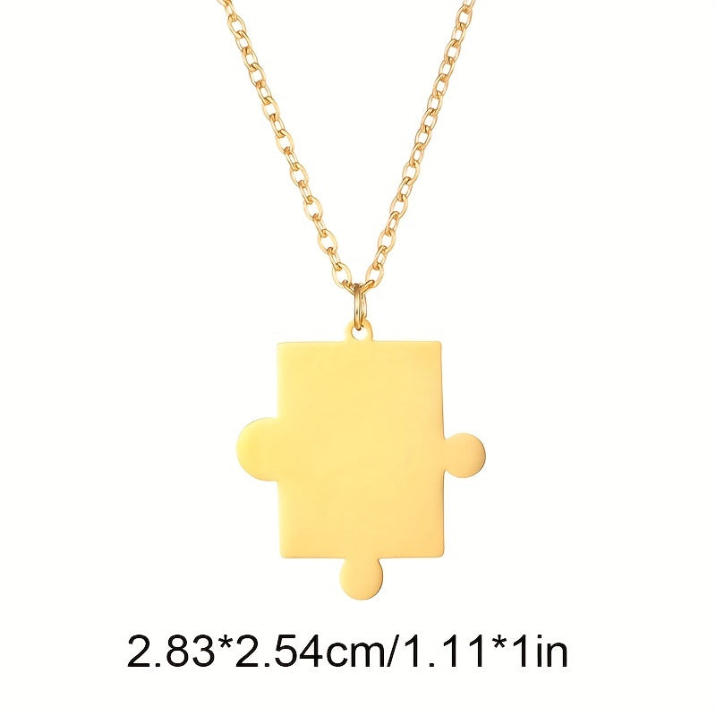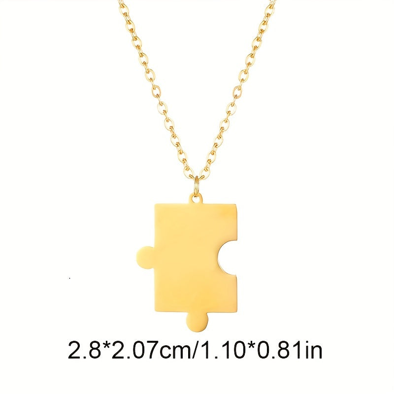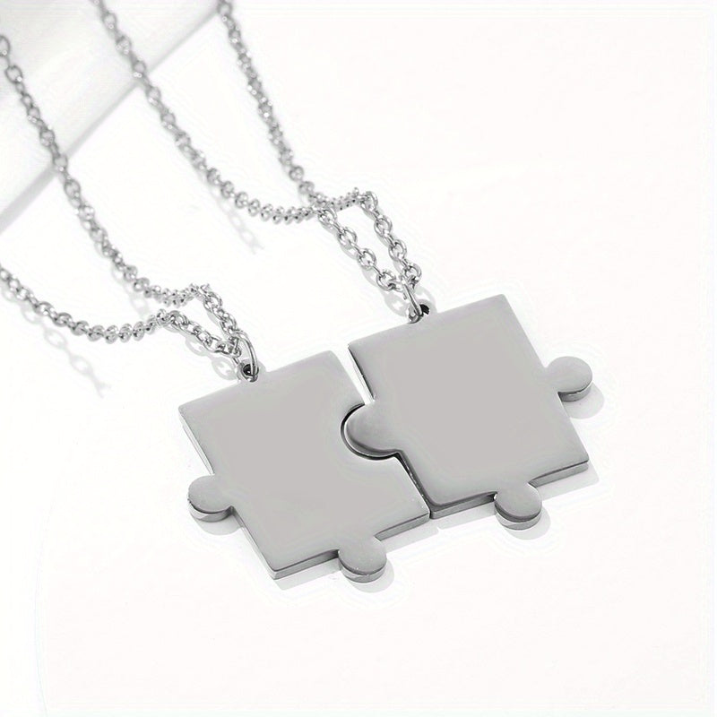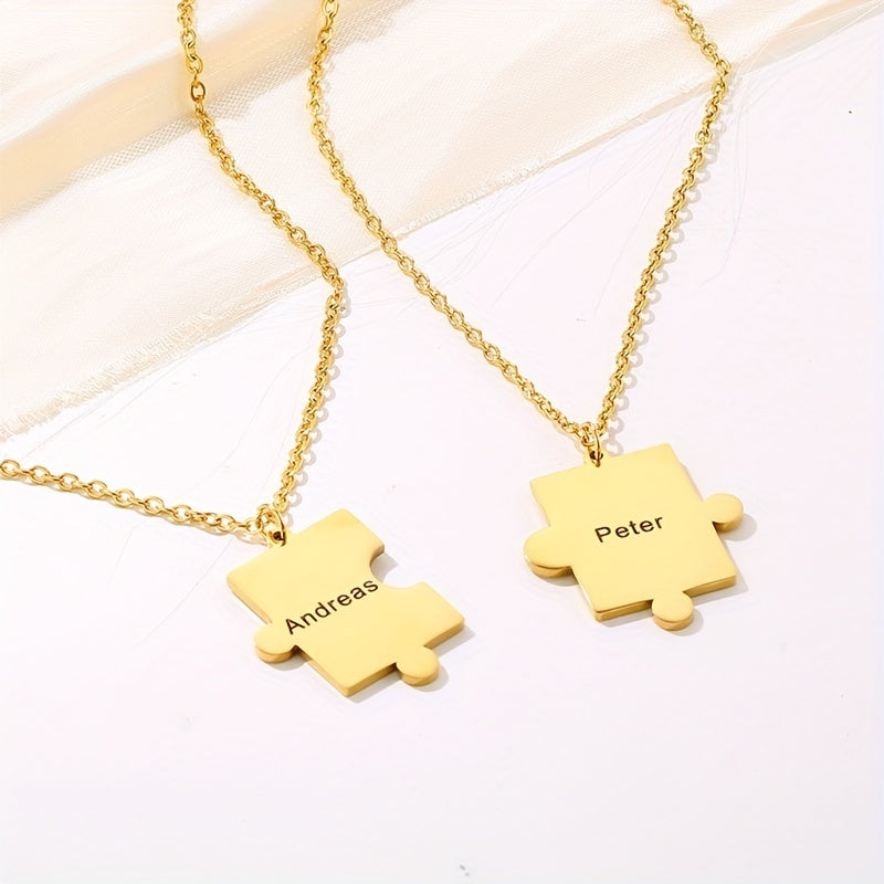 This set includes 2 geometric puzzle necklaces perfect for couples. Personalize with engraved names and dates. Made of high-quality stainless steel, ideal for men and women who love hip hop style.