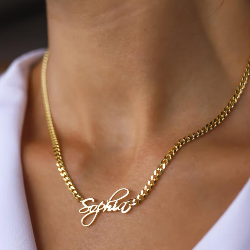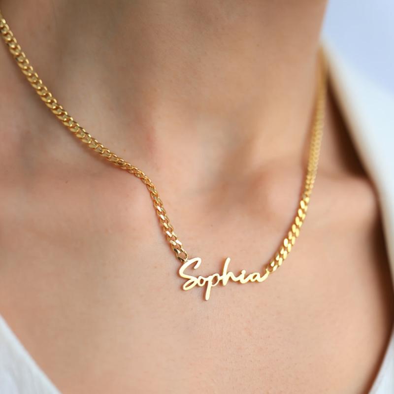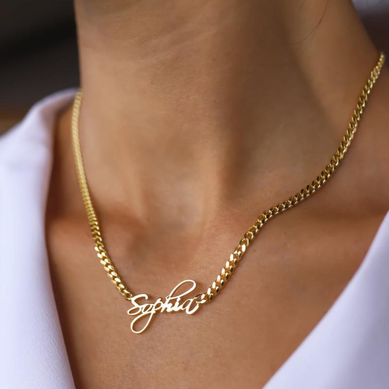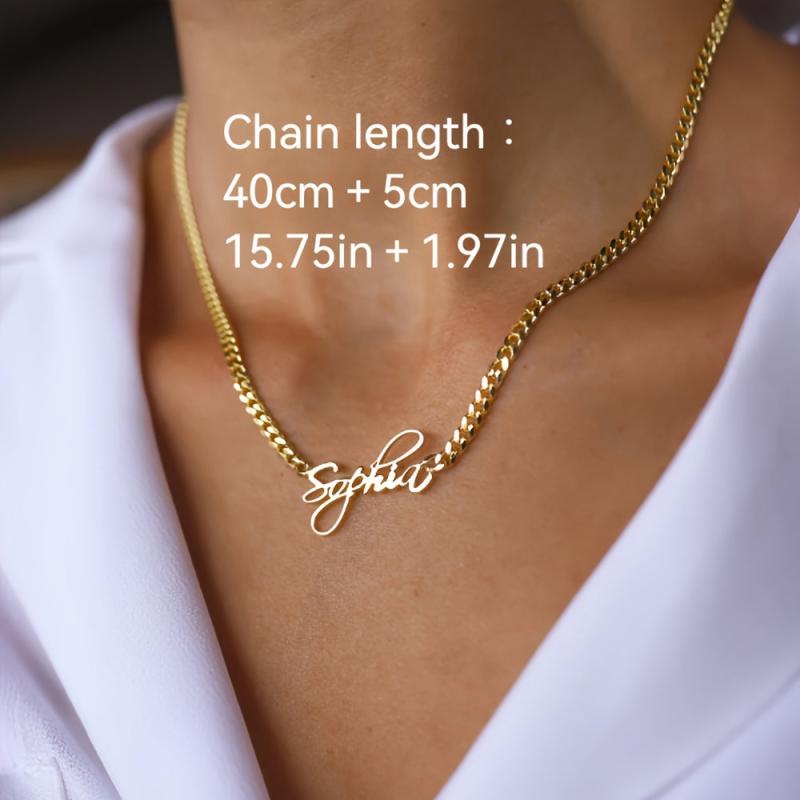 This personalized stainless steel name necklace features a vintage chain design, making it a perfect gift for women. The necklace adds a unique touch to any outfit and can be customized with a name of your choice.