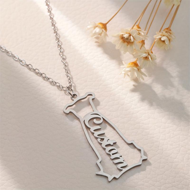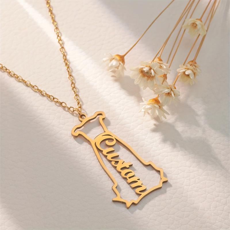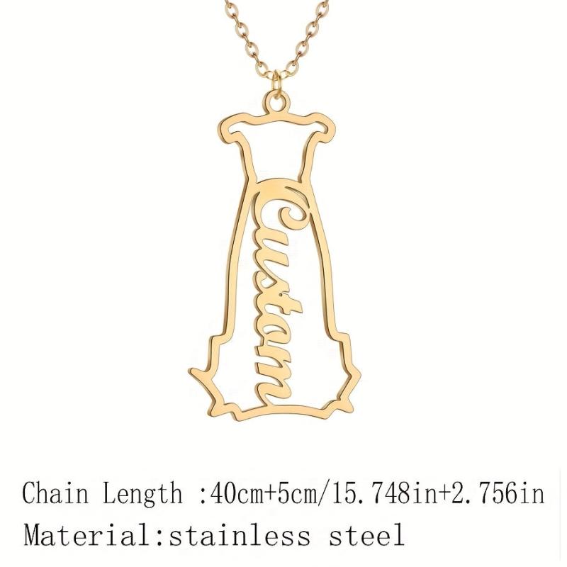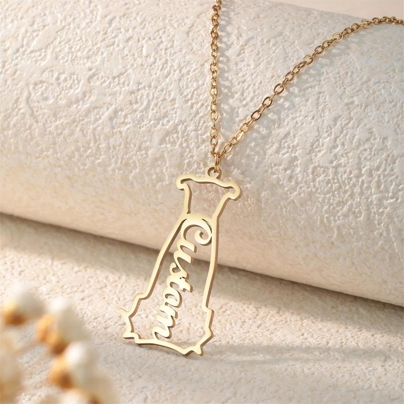 This golden tone chain necklace features a dog head pendant that can be personalized with a name. It is ideal for daily wear and as a gift for men, women, and youngsters.