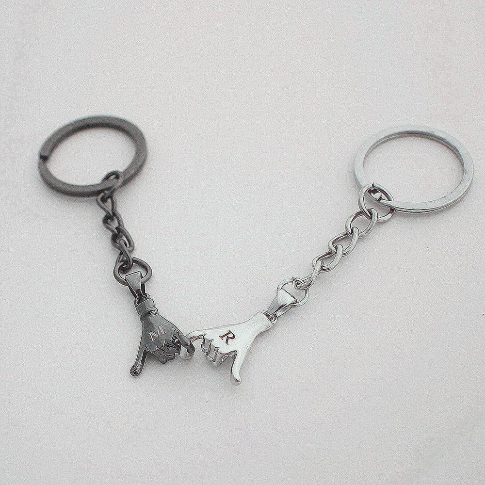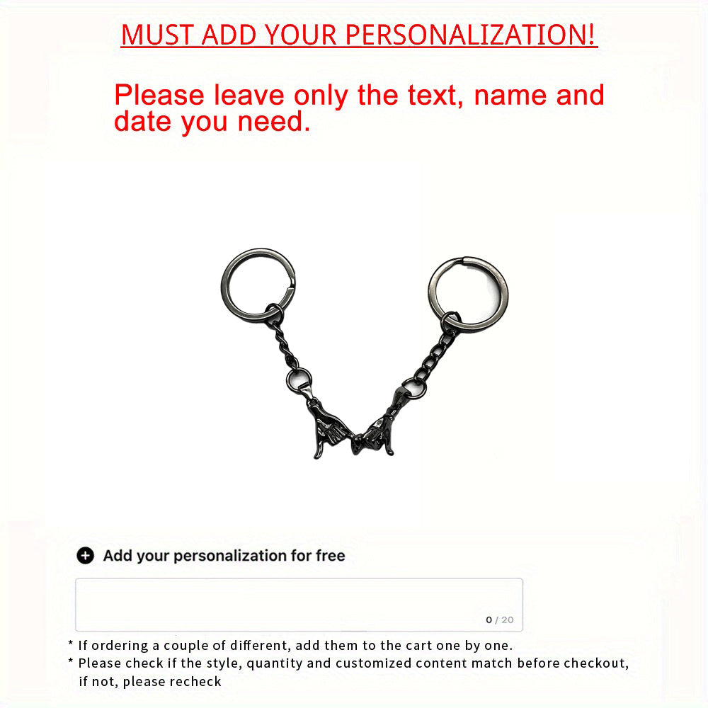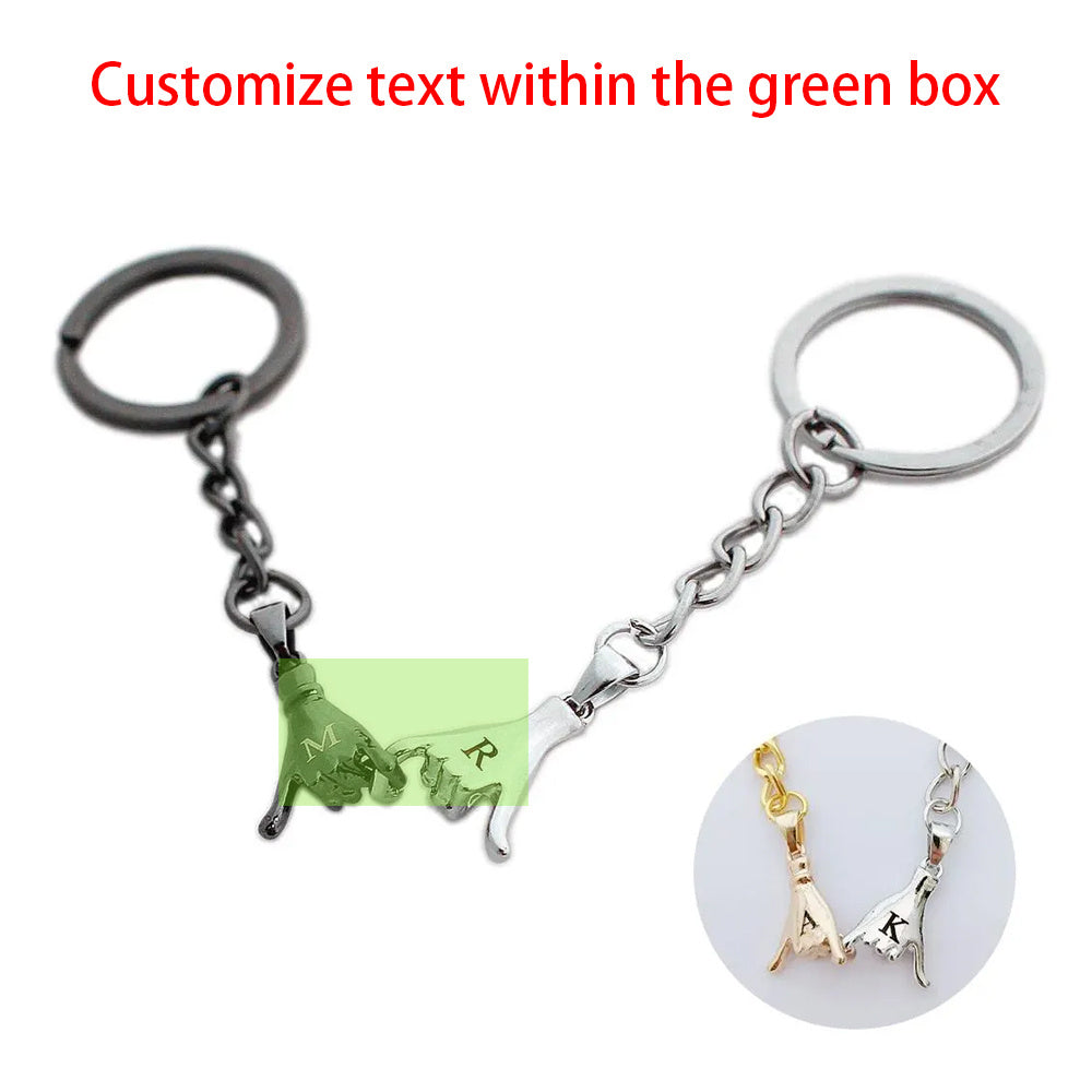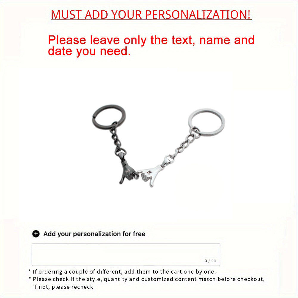 This set includes 2pcs personalized finger keychains perfect for couples. Great for newlywed wedding anniversary or any special occasion.