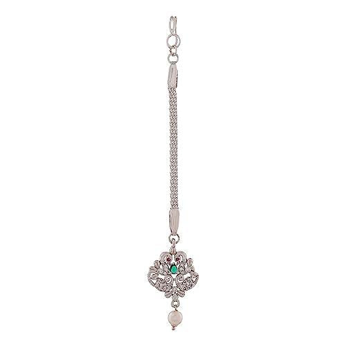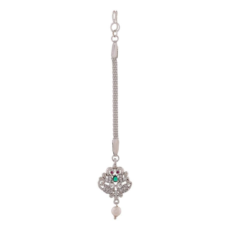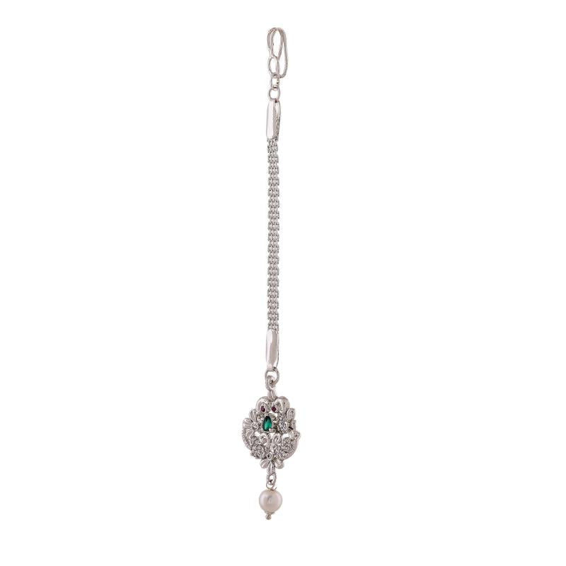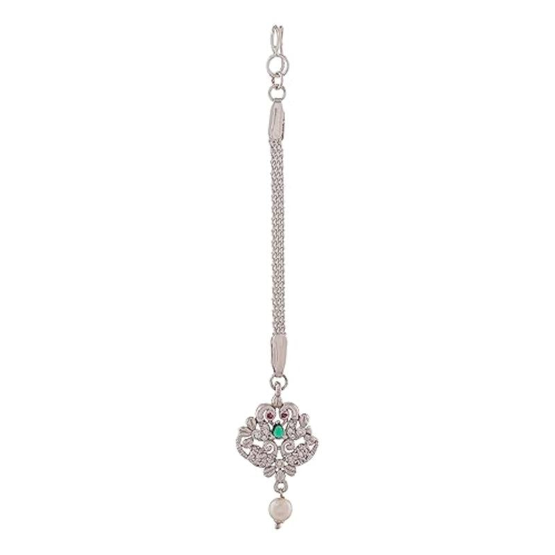 Elegant maang tikka featuring CZ stones and pearls, perfect for special occasions.