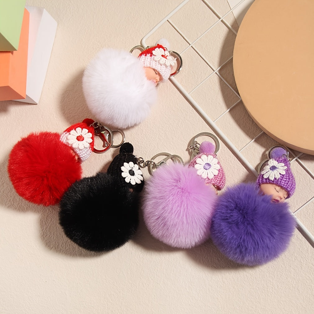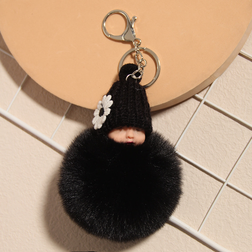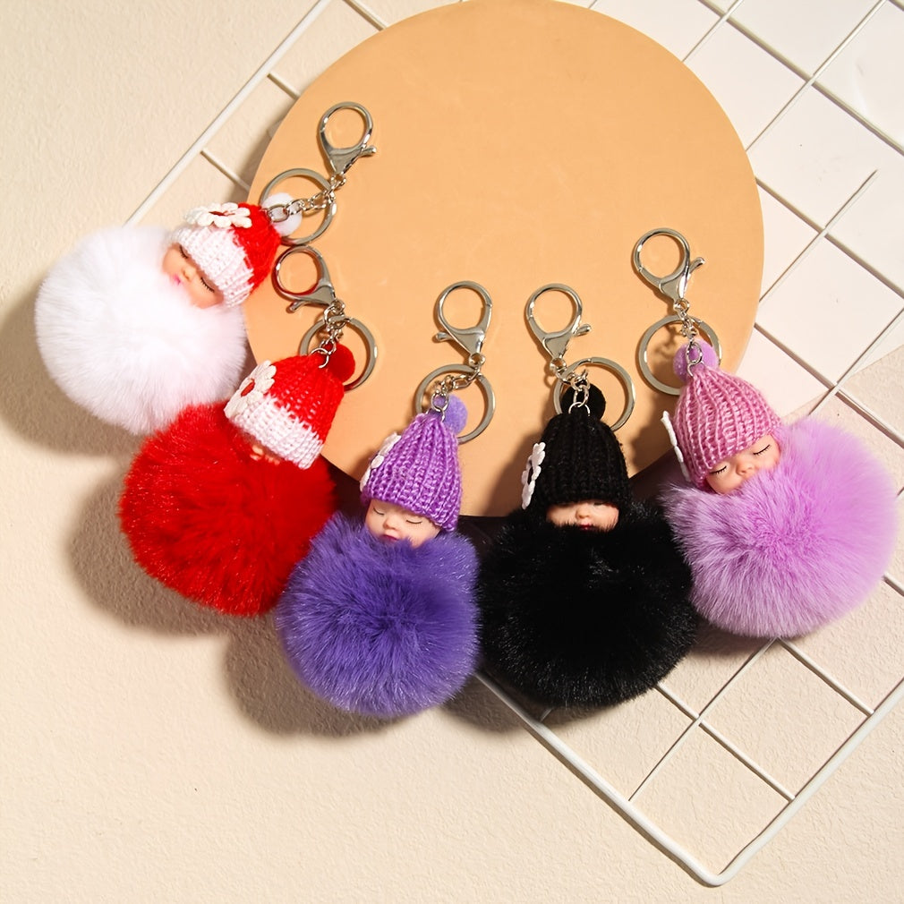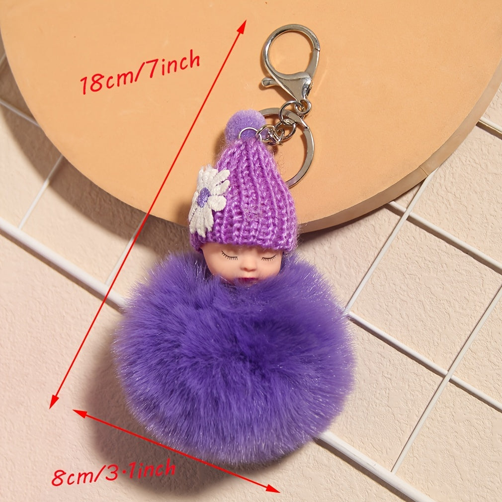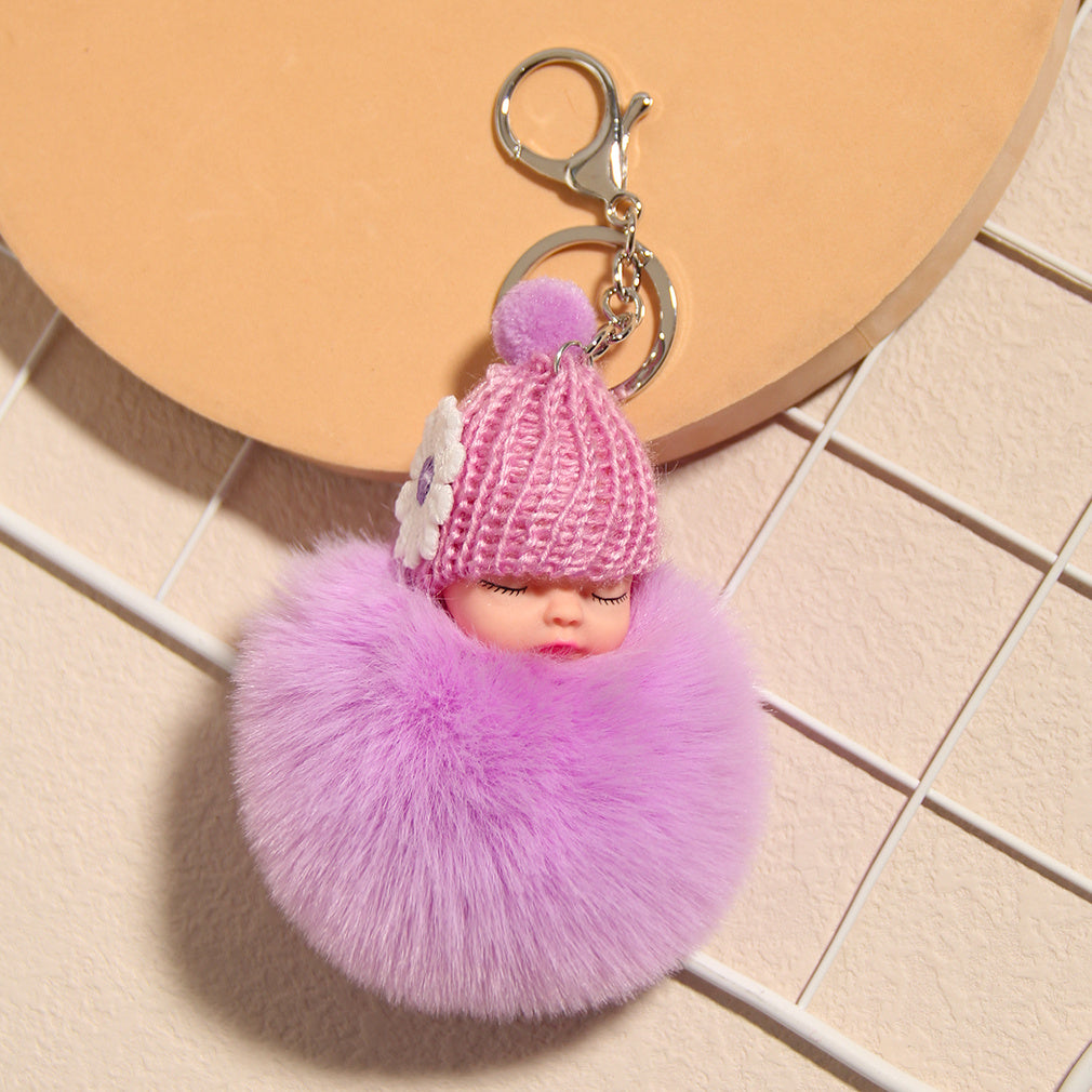Adorable keychain featuring a sleeping baby design with a furry texture.
