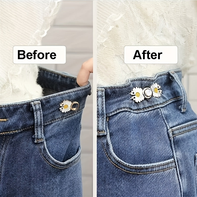 This Daisy Adjustable Waist Tightener Buckle is perfect for adjusting the waist of your pants, jeans, skirts, and more. It can also be used as a collar button or brooch pin. Easy to sew on and provides a secure fit.