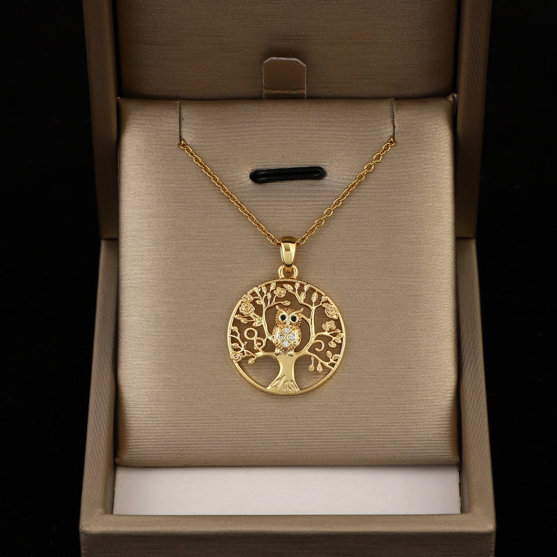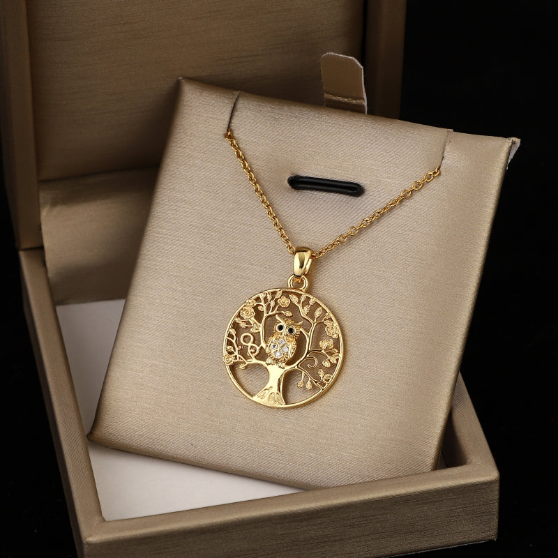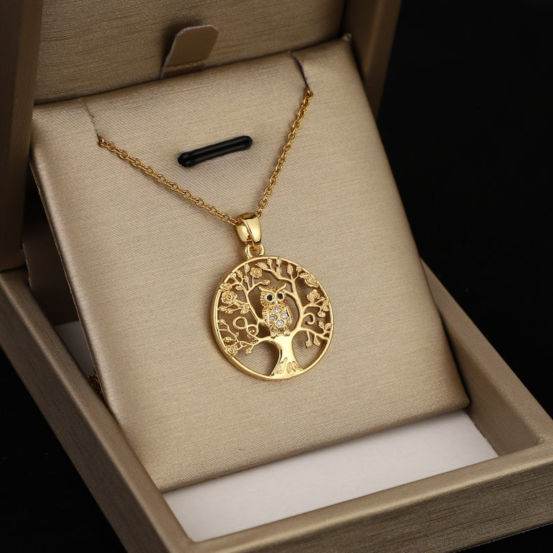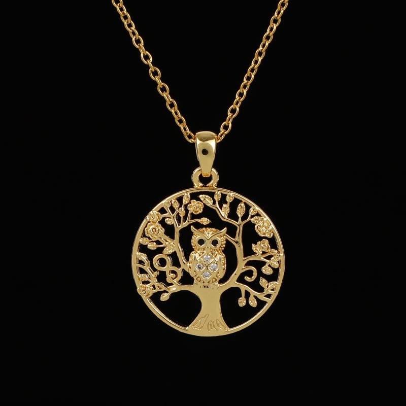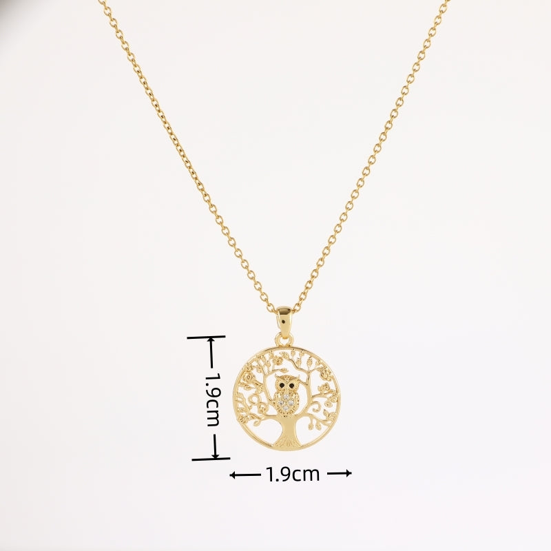 Beautiful round pendant necklace featuring a hollow owl in a tree design. Suitable for both men and women.