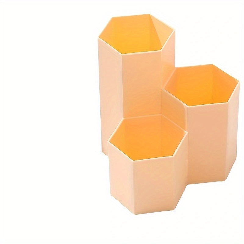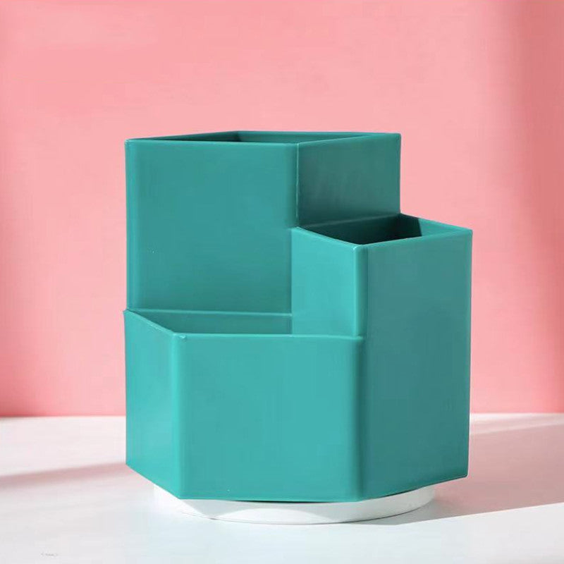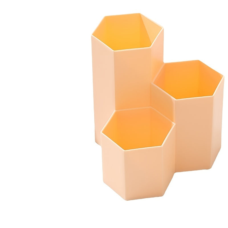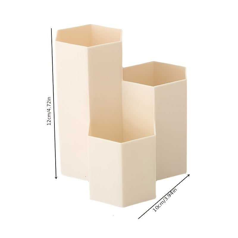 Organize your cosmetics and jewelry with this creative desktop storage rack. Features 3 storage buckets for easy access and convenience.
