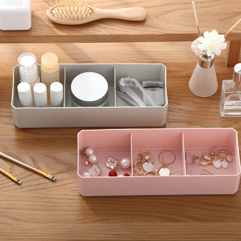 Keep your cosmetics organized and easily accessible with this desktop divider storage box. It features three compartments to store makeup, cotton swabs, and other miscellaneous items, while keeping them dust-free.