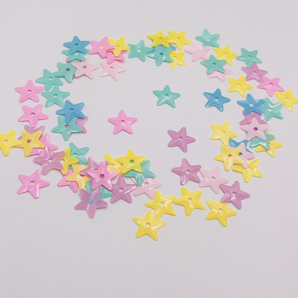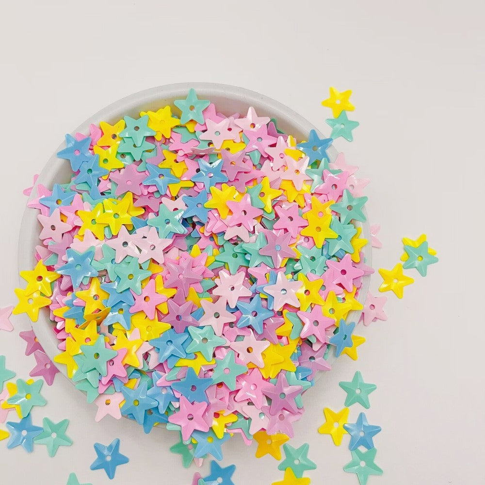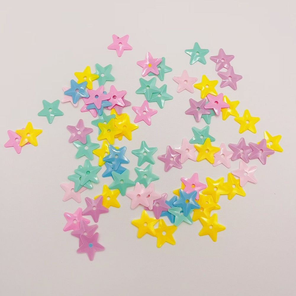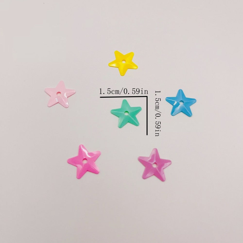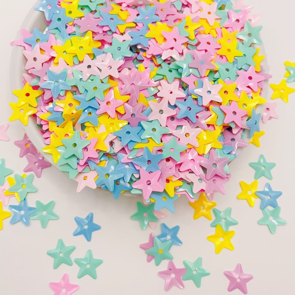 Get creative with this 10g pack of plastic five-pointed star sequins, perfect for adding a touch of sparkle to your DIY projects. Use them to embellish jewelry or craft intricate designs.