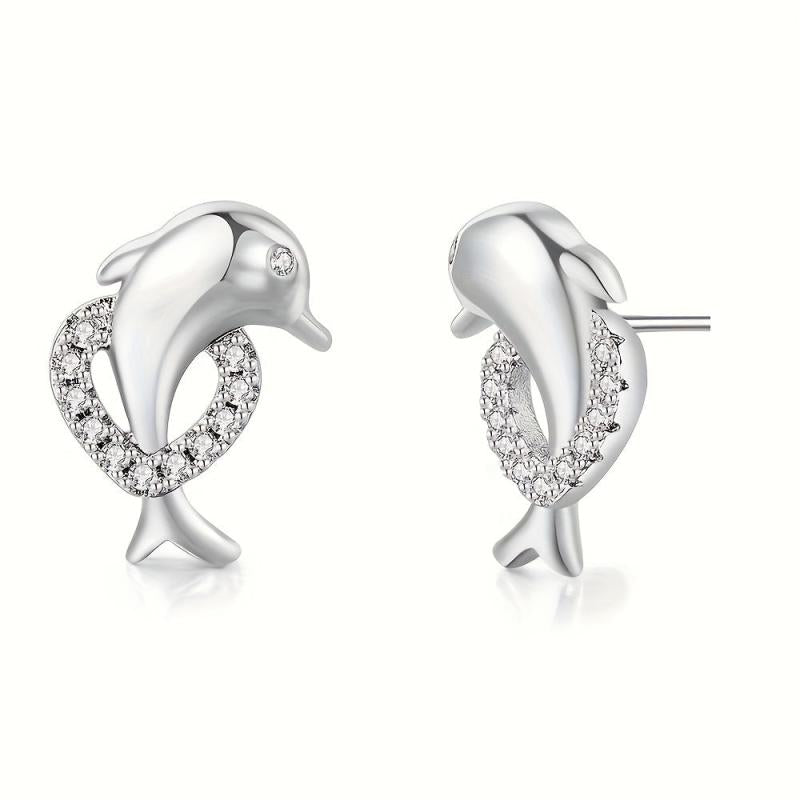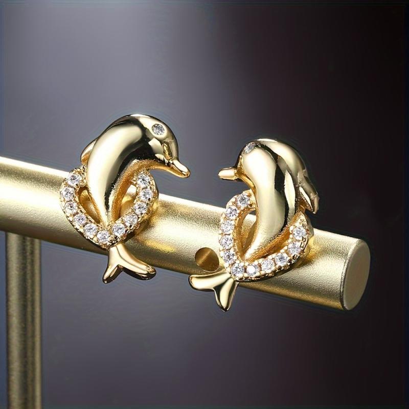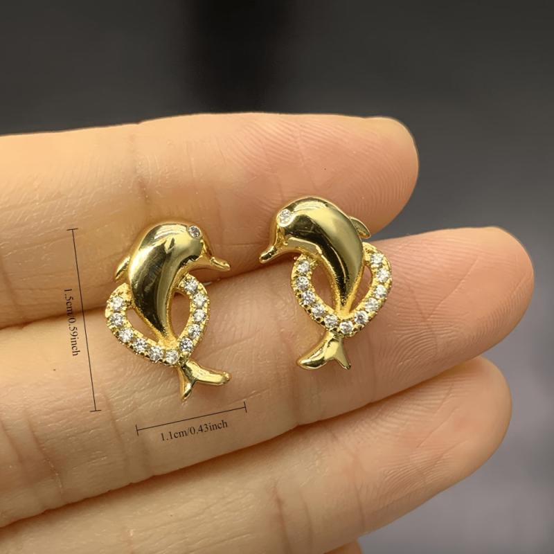 These dolphin earrings are crafted in golden tone copper and adorned with synthetic zirconia, making them perfect for weddings, engagements, parties, and Christmas celebrations.