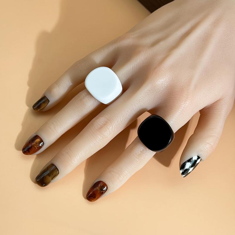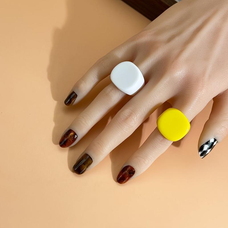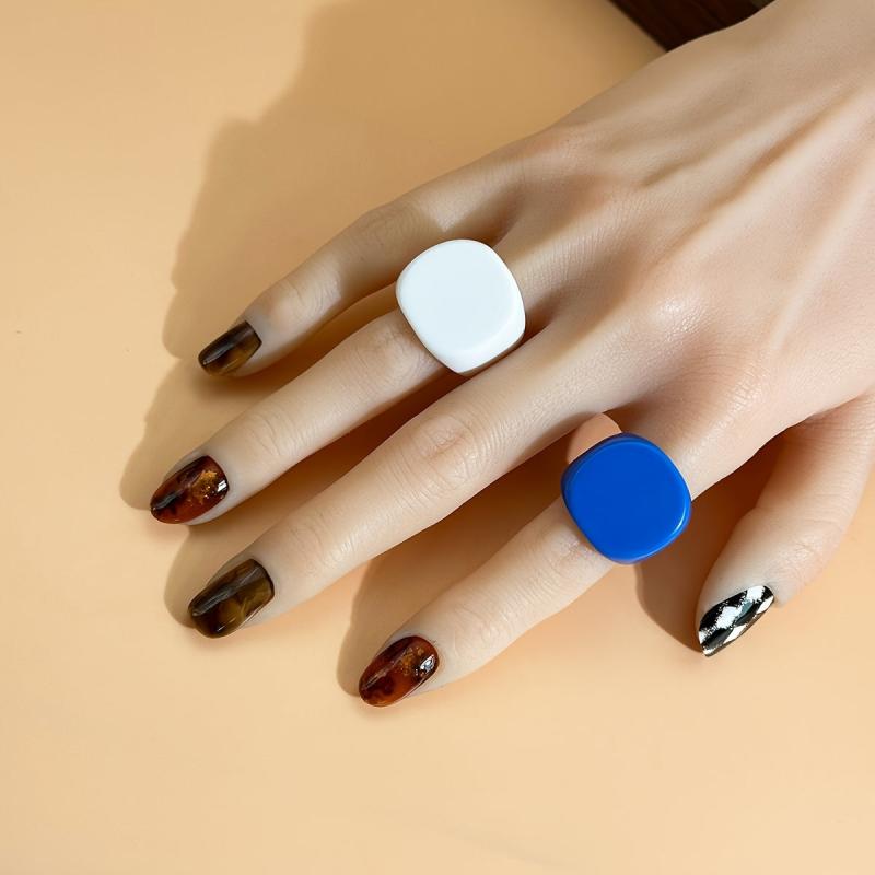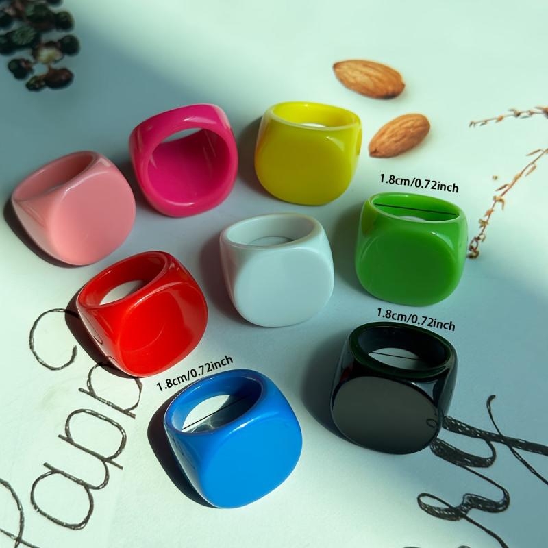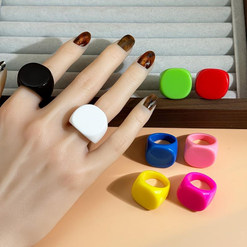 Elevate your everyday style with these round resin rings that exude personality and vibrancy. The solid flat design adds a touch of modern flair to any outfit.