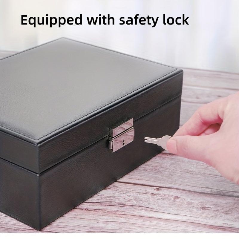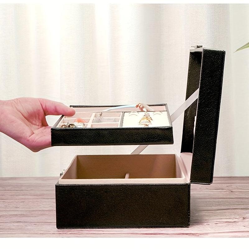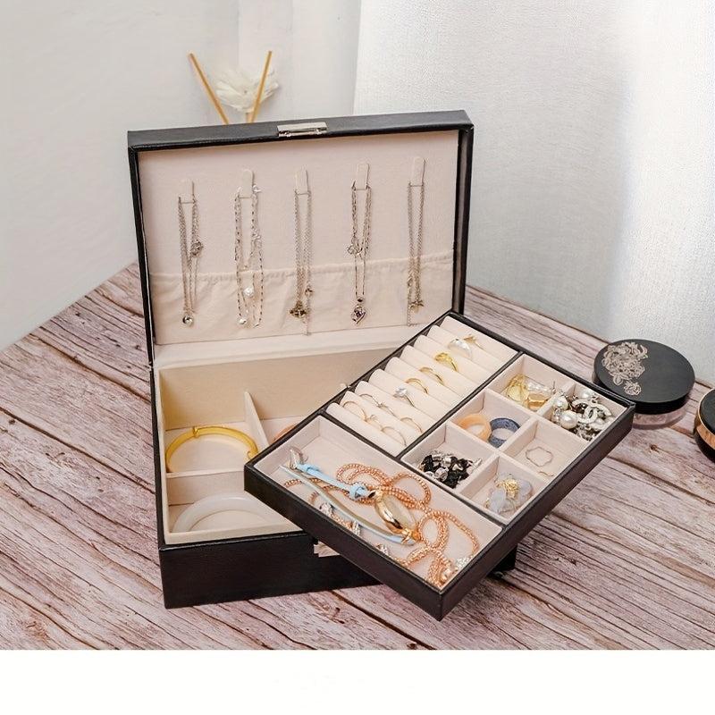 Keep your jewelry organized and easily accessible with this double-layer storage box. The box features compartments for rings, earrings, necklaces, and more, making it a versatile storage solution for all your jewelry needs.