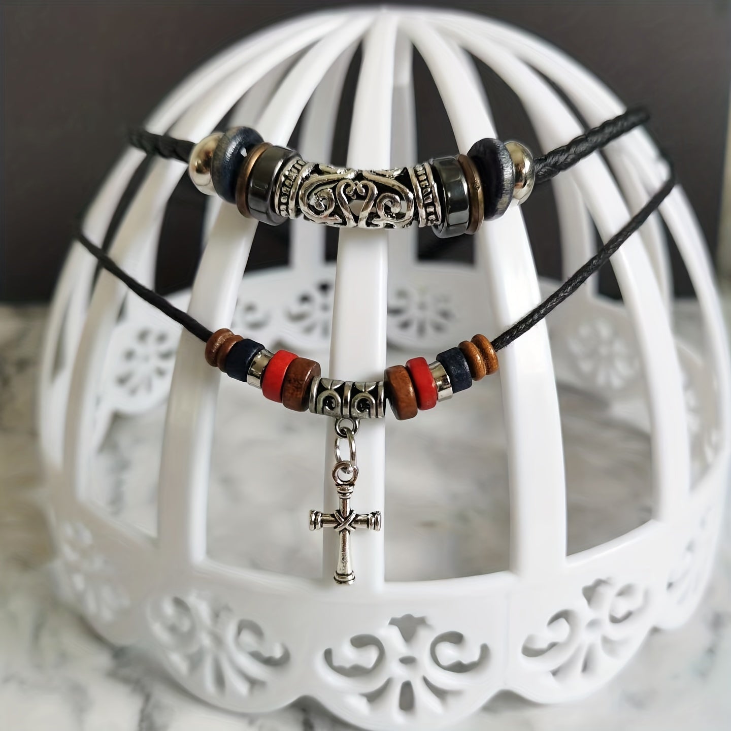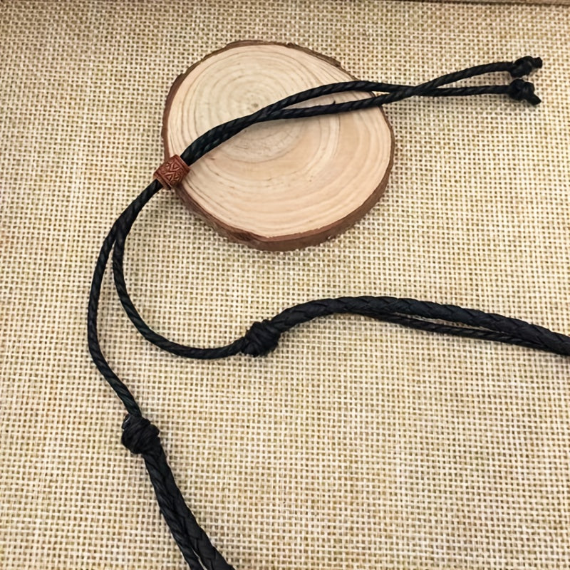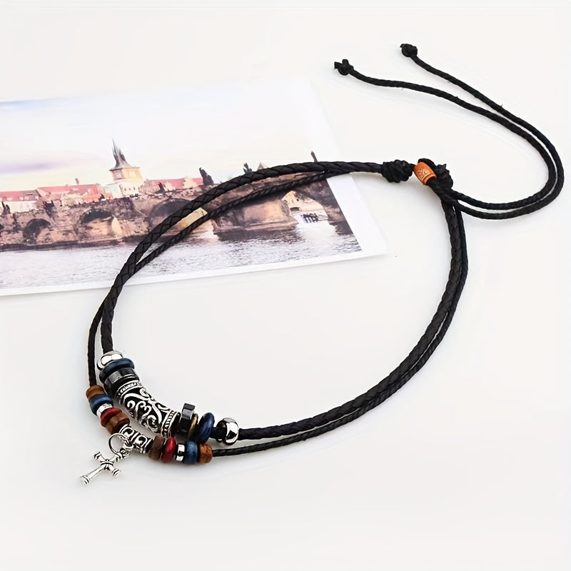 Elevate your style with this vintage-inspired double layer tribal necklace featuring a braided faux leather design and a cross pendant.