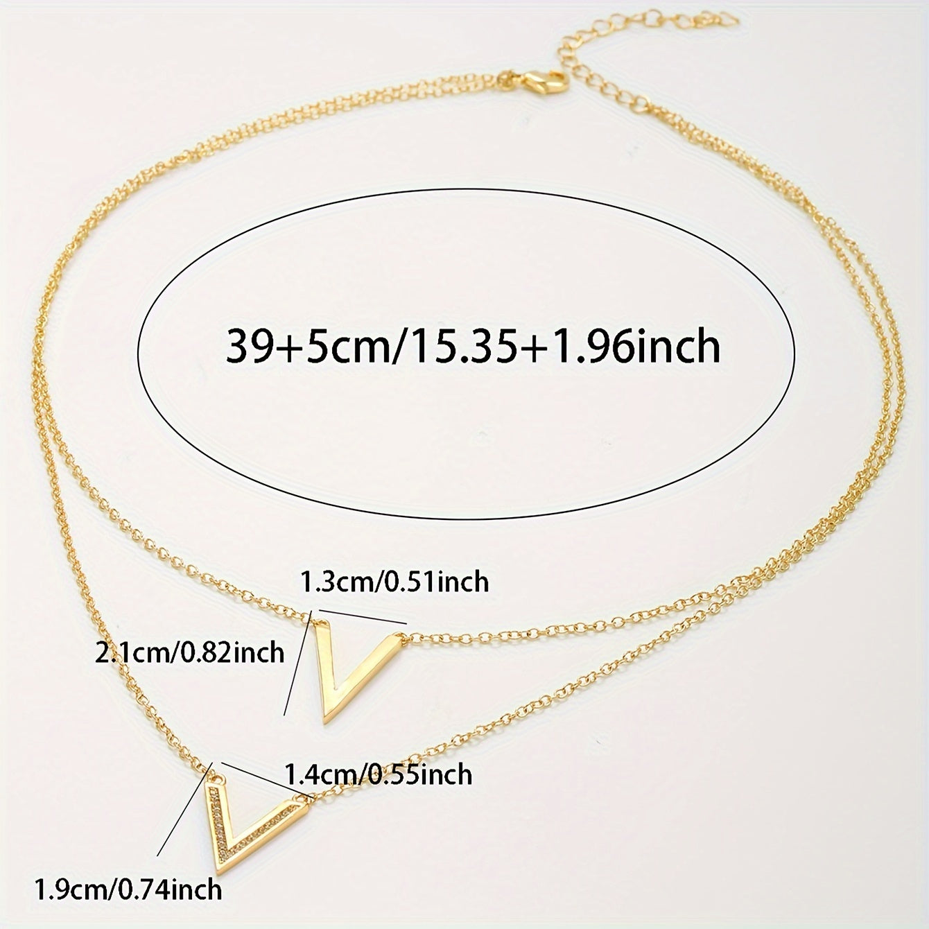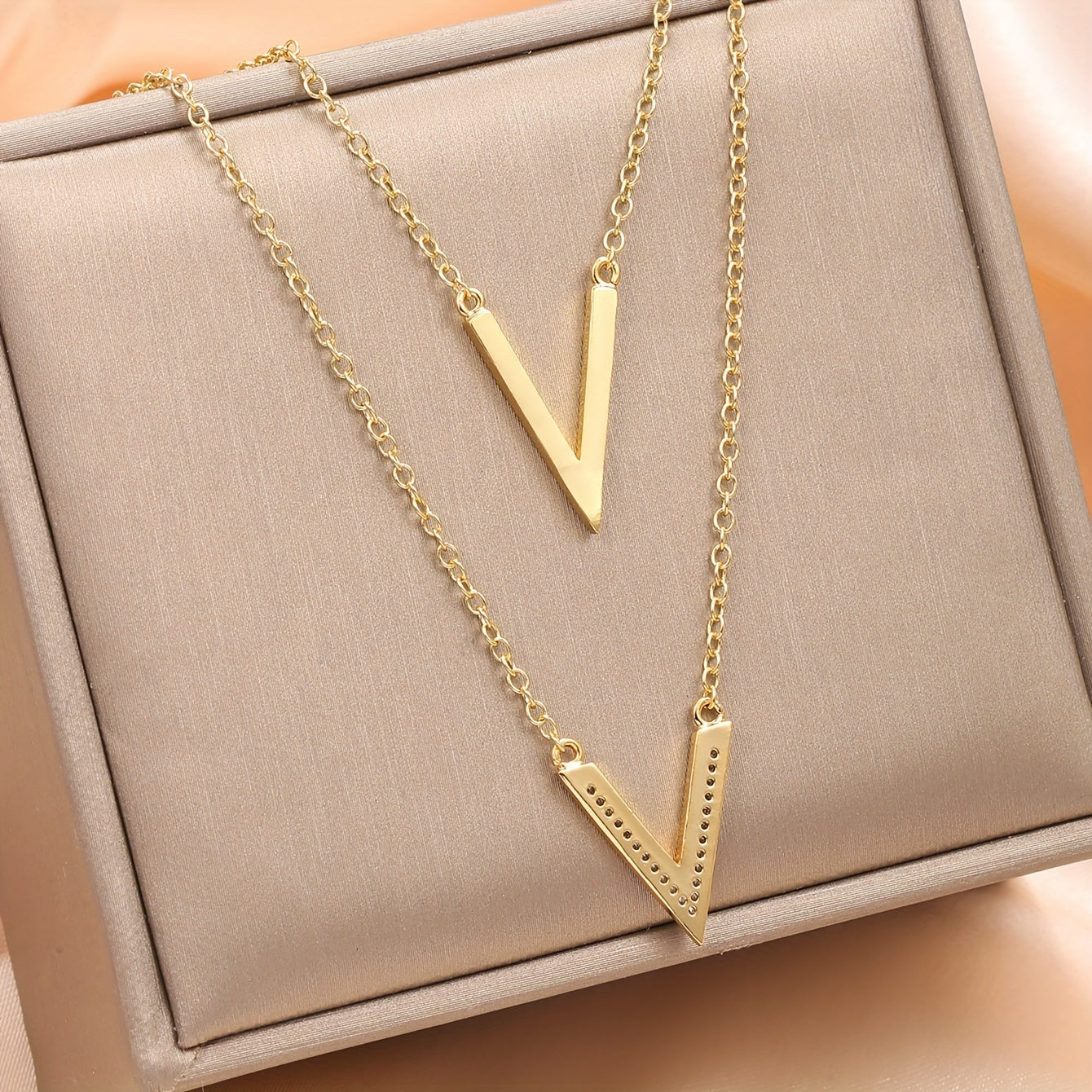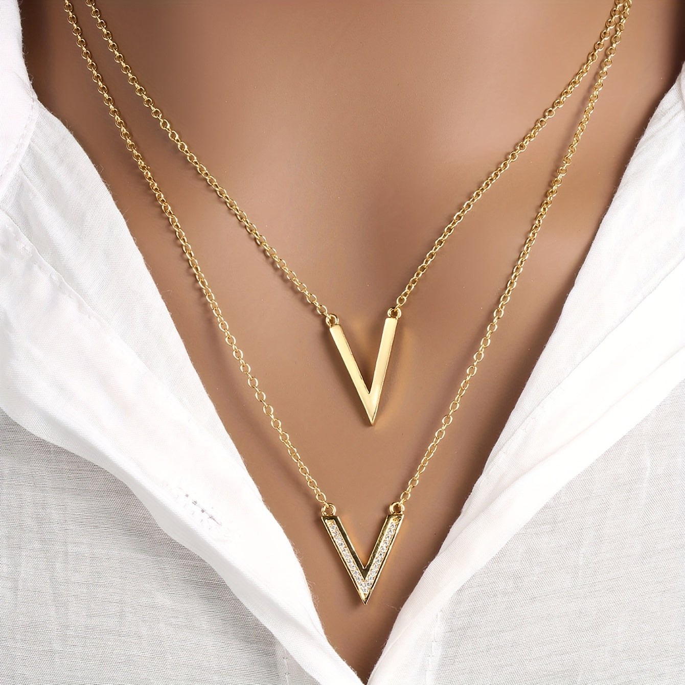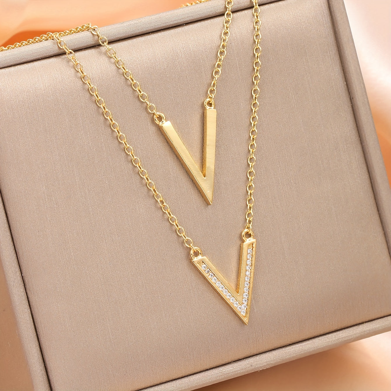 Elegant double layer necklace featuring a V-shaped pendant with sparkling crystals. This minimalist and versatile piece is perfect for everyday wear and makes a great gift for her.