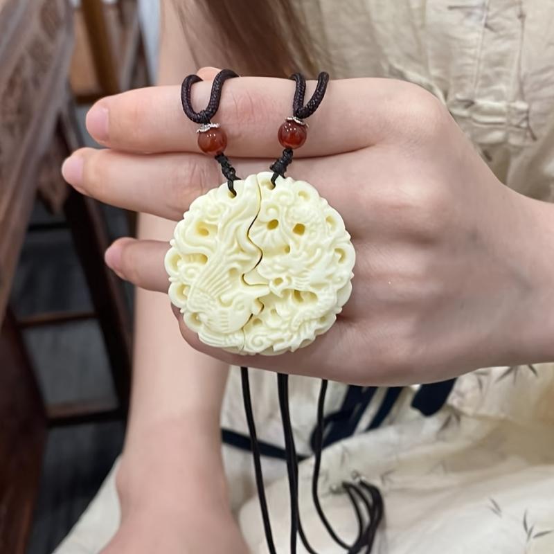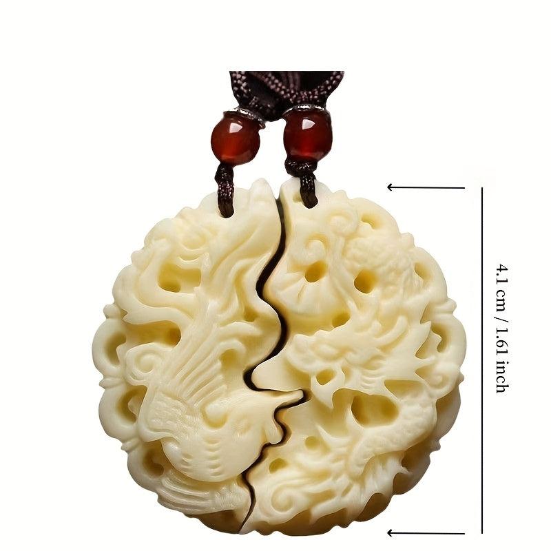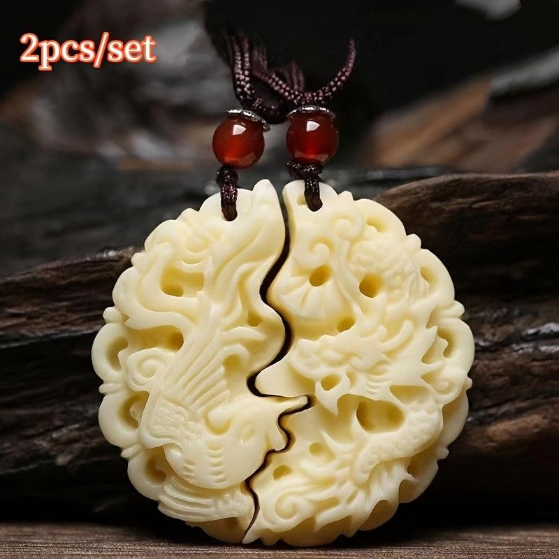 This 2pcs Set Dragon and Phoenix Couple Necklace is a symbol of good luck and long-lasting happiness. The male pendant features a dragon, while the female pendant features a phoenix, representing a harmonious union.