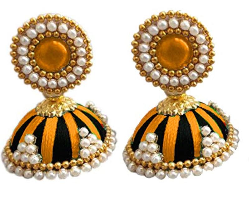 This set includes a pair of beautiful jhumki earrings with silk dori design. Perfect for adding a touch of elegance to your outfit.