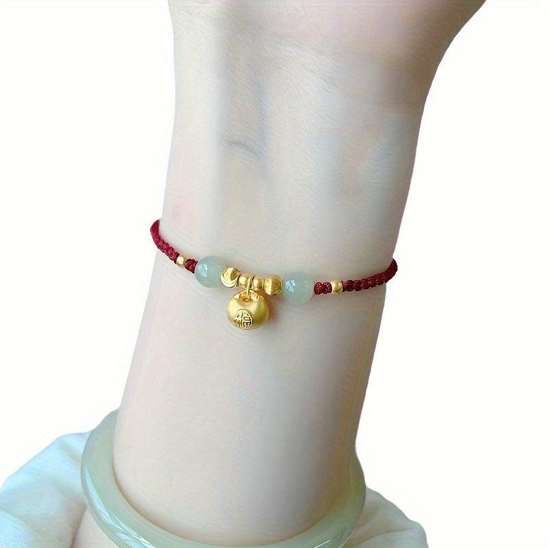 This elegant women's bracelet features a red braided rope with golden accents and a green bead, adding a touch of charm to your outfit.