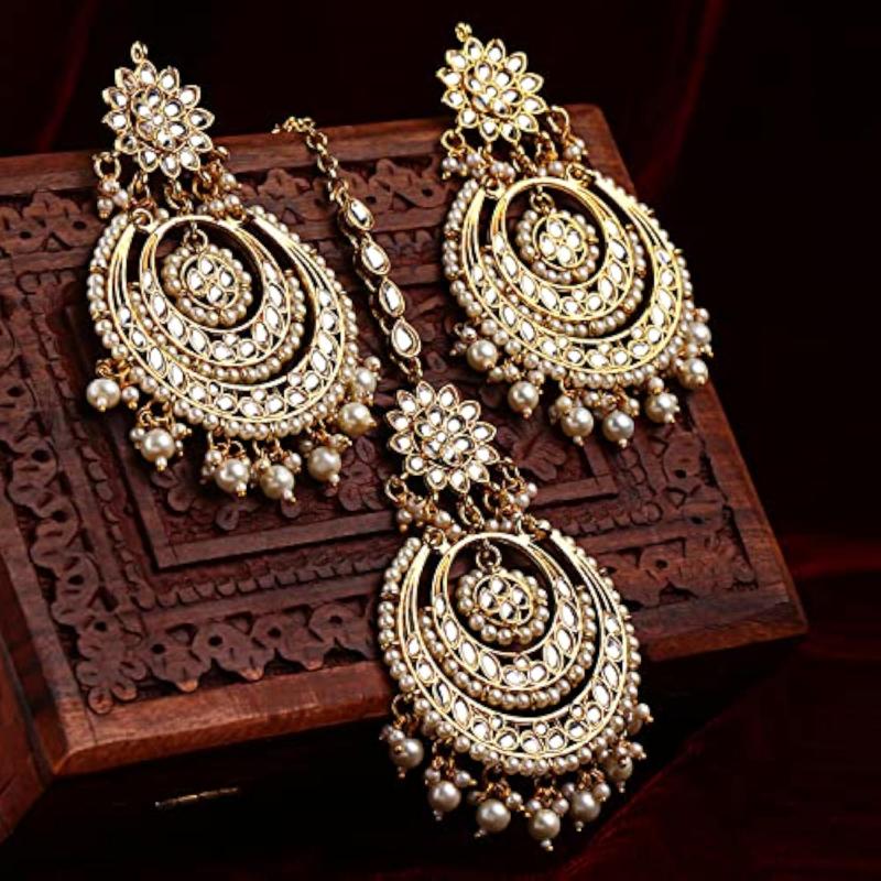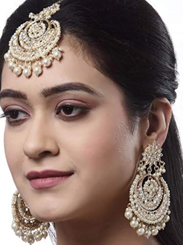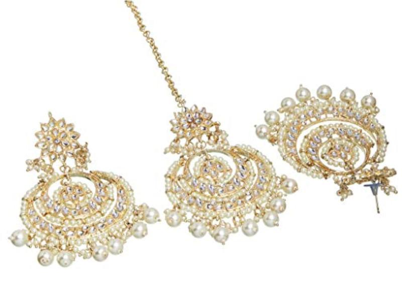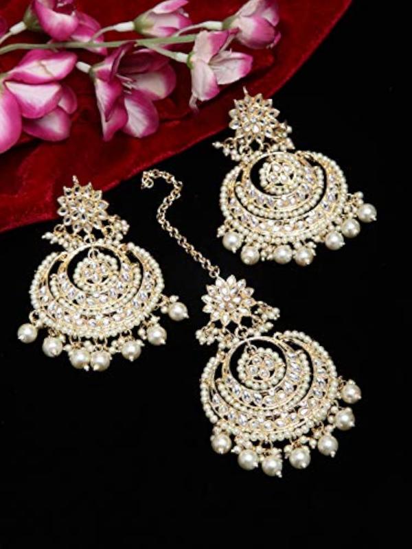 Make a statement with these stunning Kundan Maang Tikka and Earrings set. Handcrafted Indian Jewelry adds a touch of elegance to any outfit.