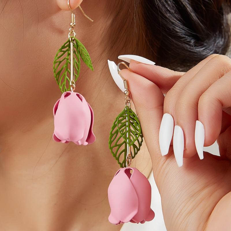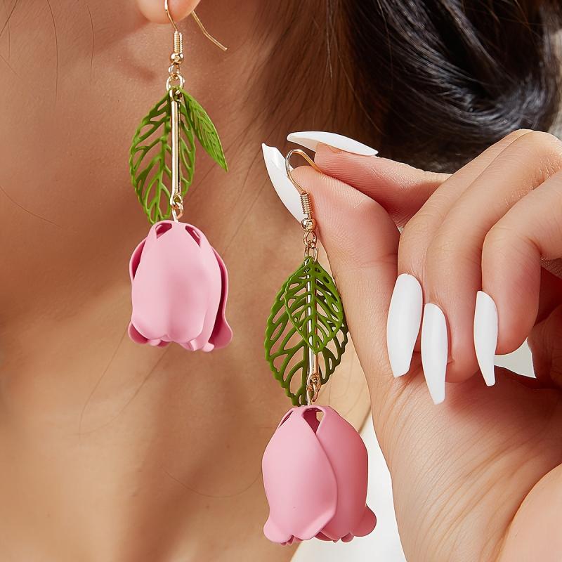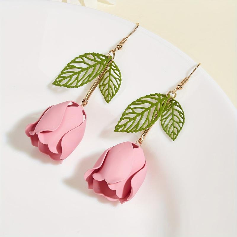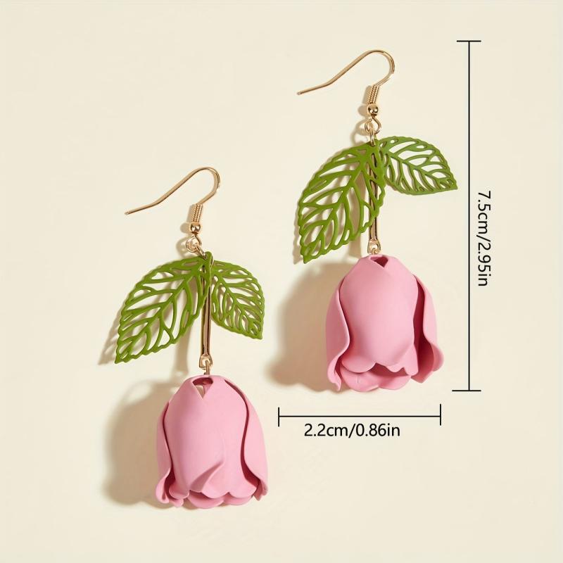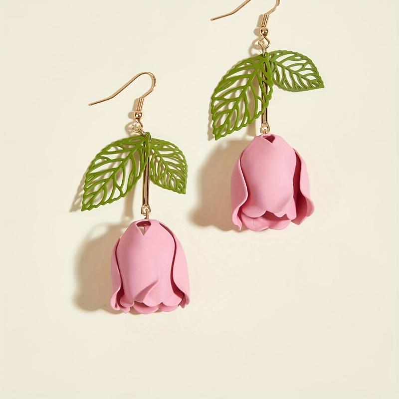 These exquisite tulip rose flower dangle earrings are crafted from iron with golden tone hooks, perfect for adding a touch of elegance to any outfit. Ideal for gifting or wearing on vacation.