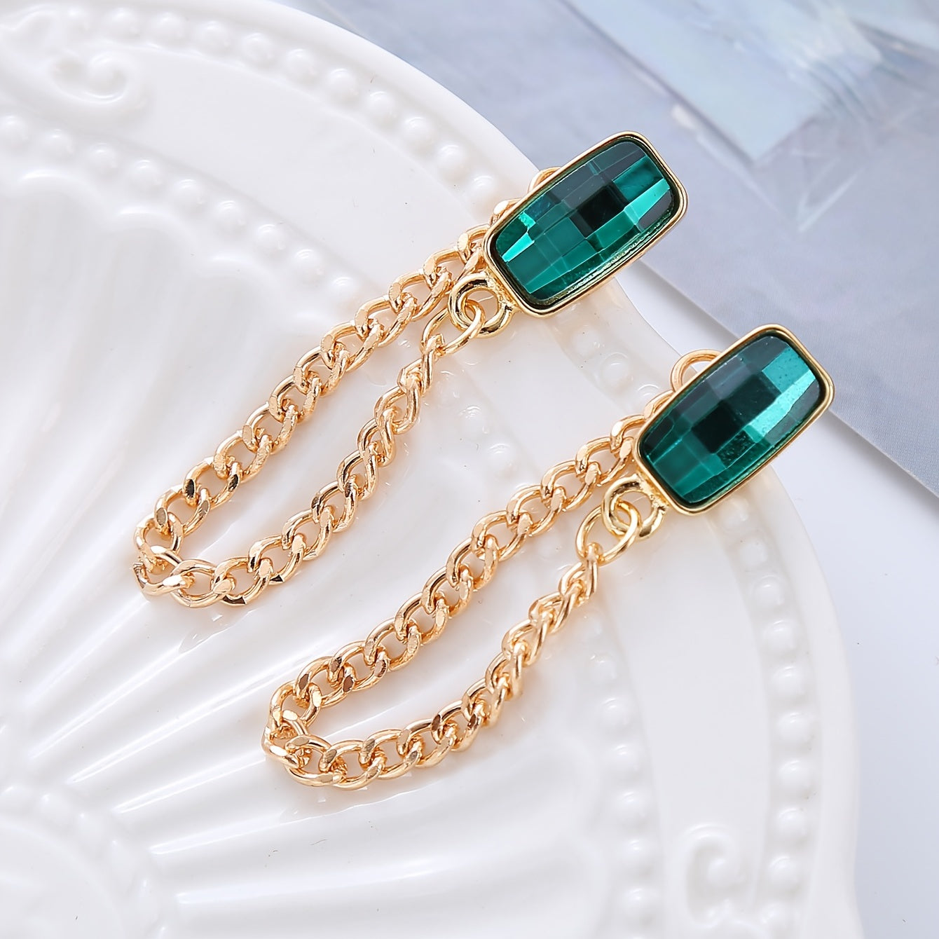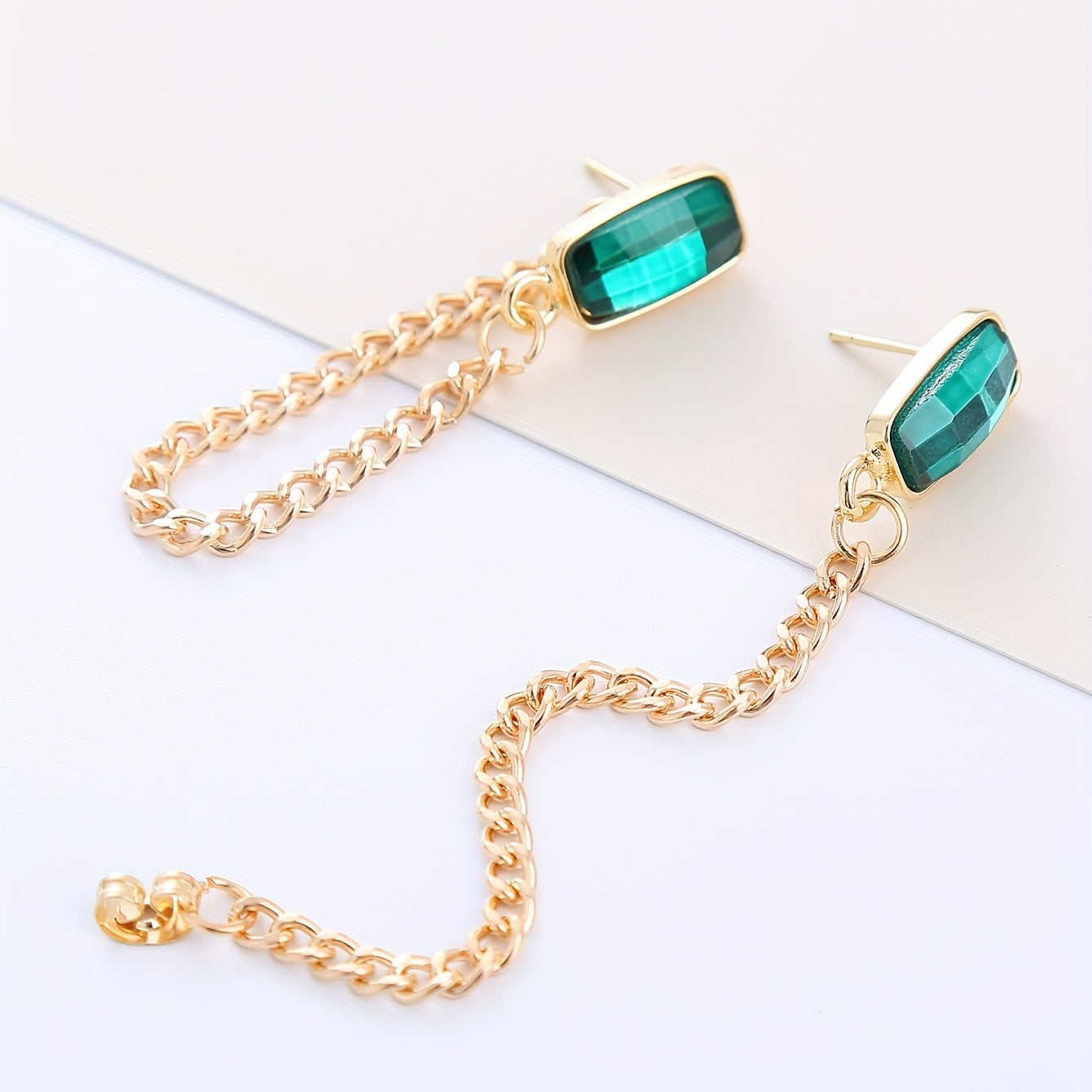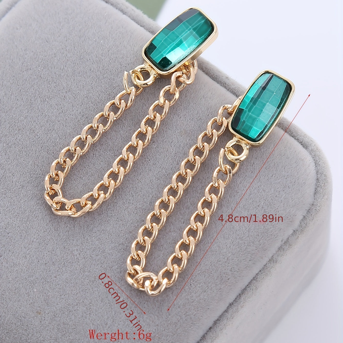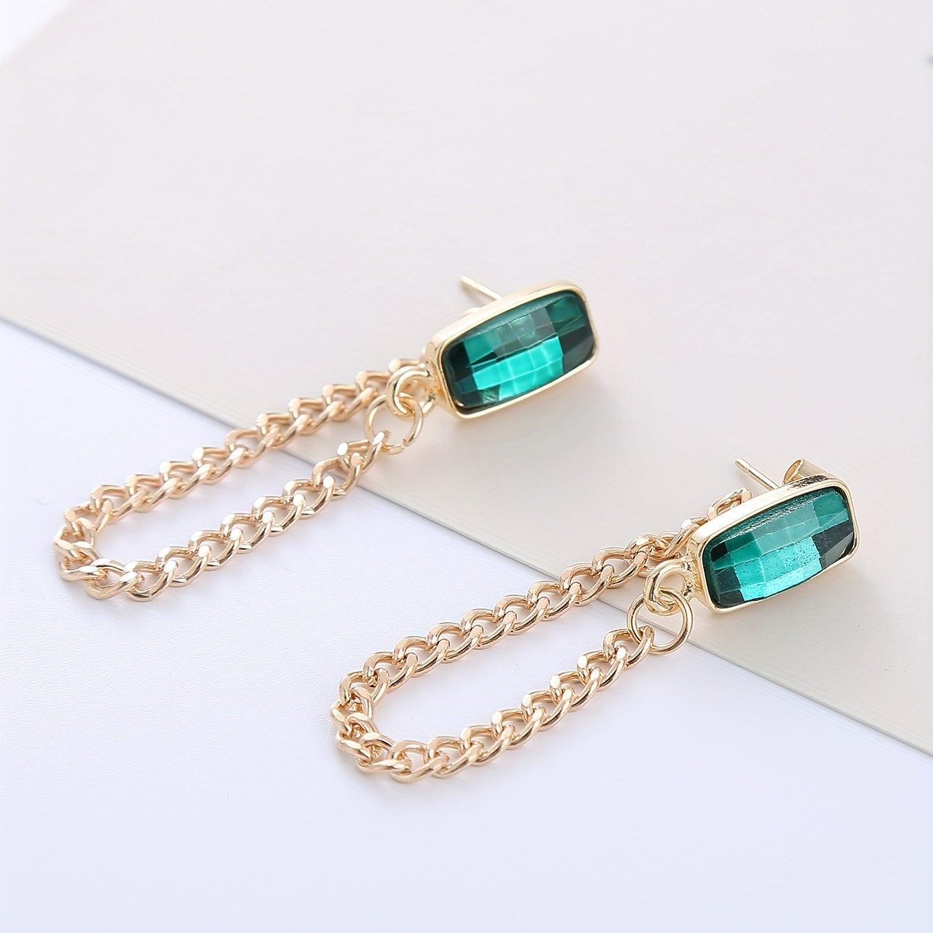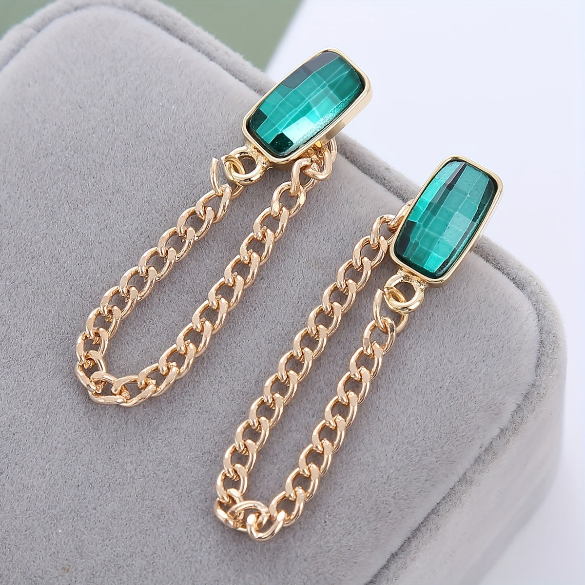 Elevate your style with these stunning cuboid emerald glass chain stud earrings, crafted in retro style zinc alloy with 18K gold plating. Perfect for banquet occasions or everyday wear.