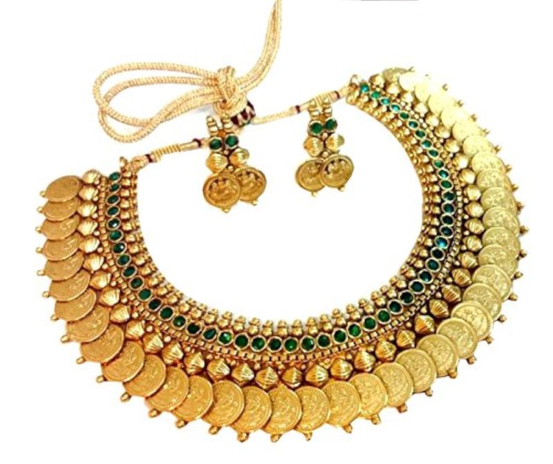 Adorn yourself with this stunning traditional necklace set featuring emerald temple coins. Perfect for special occasions or everyday wear.