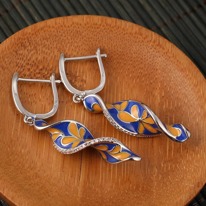 Pair of retro spiral leaf design earrings with orange floral enamel and golden plating, perfect for weddings and parties.