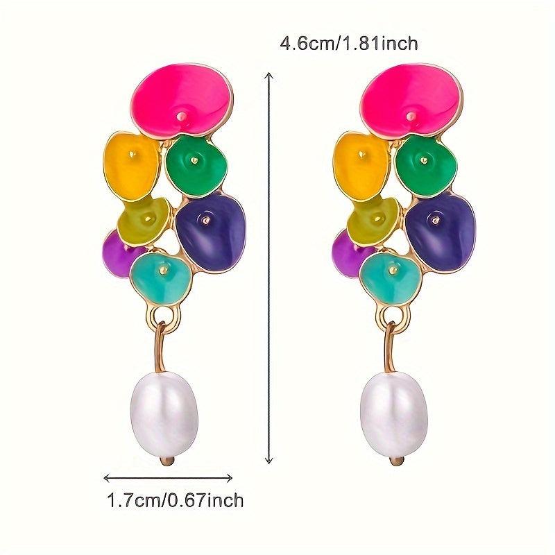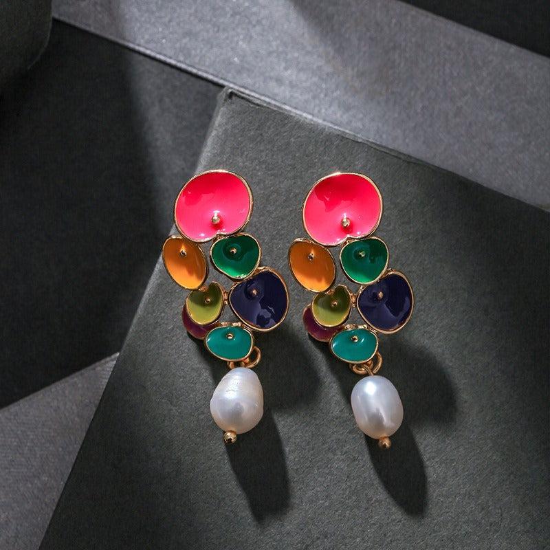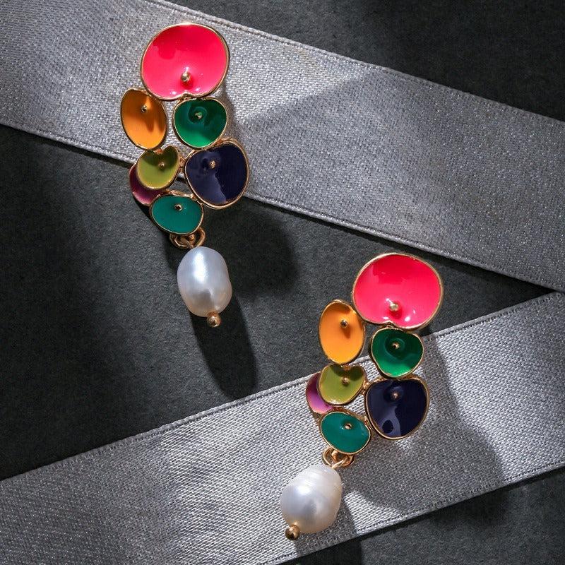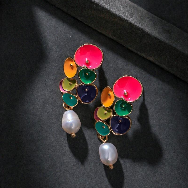 Multicolor enamel flower earrings with freshwater pearl and whimsical sterling silver posts in golden tone finish.