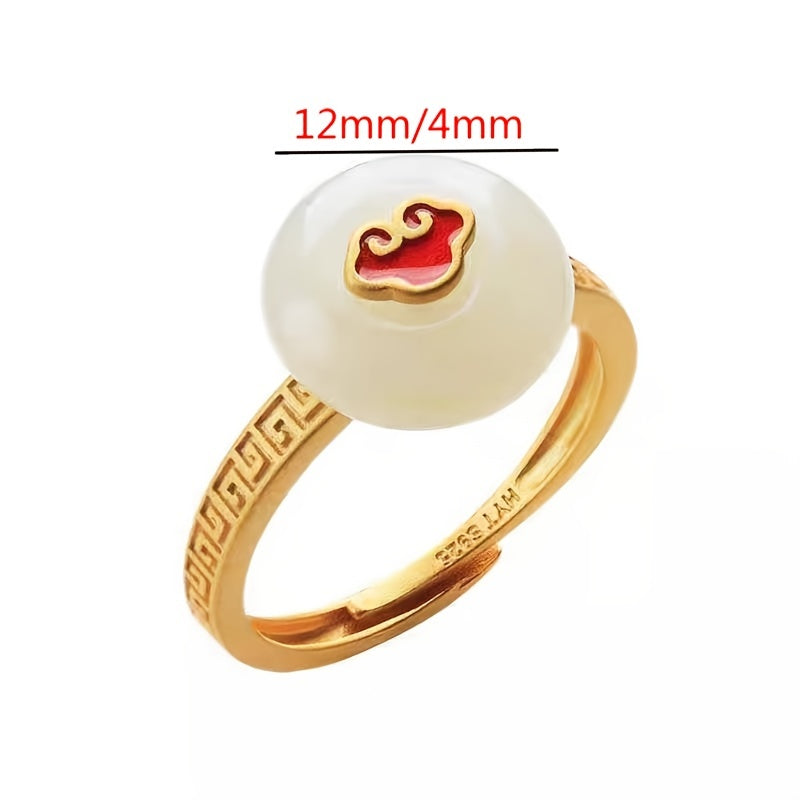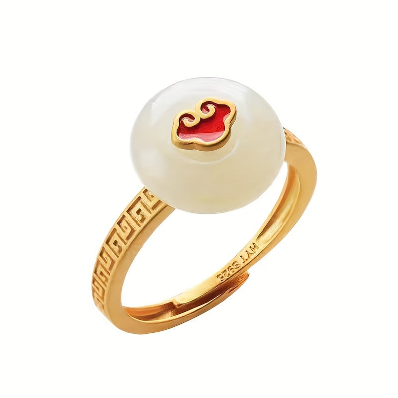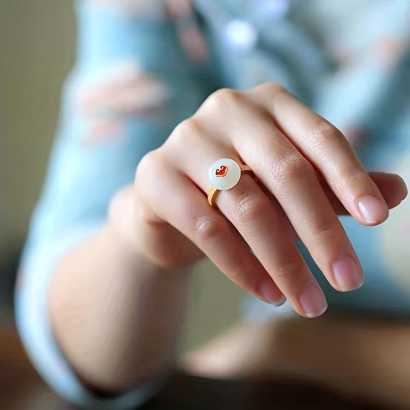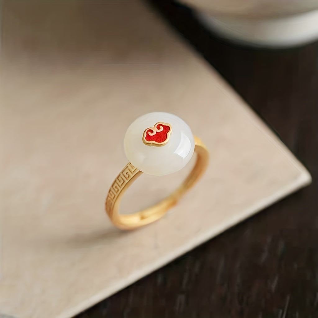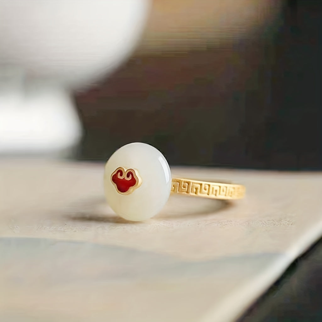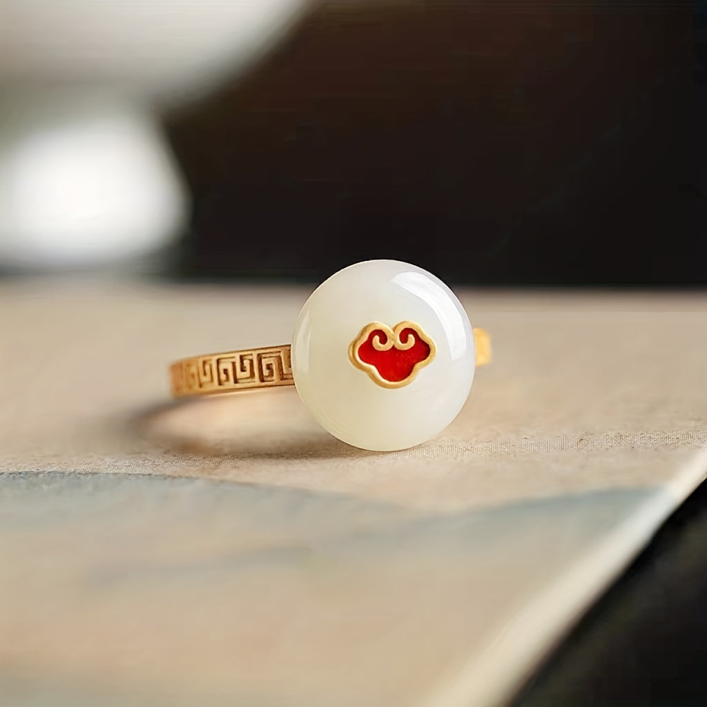 This stylish ring features a beautiful enamel red cloud design on a round jade stone. It is a fashionable accessory that adds a touch of elegance to any outfit.