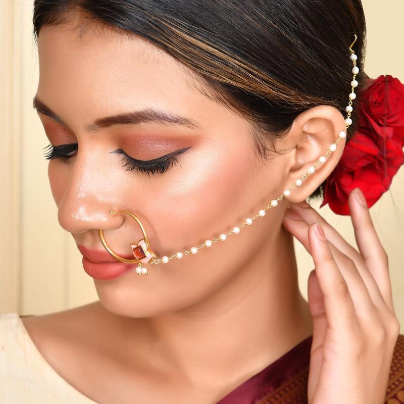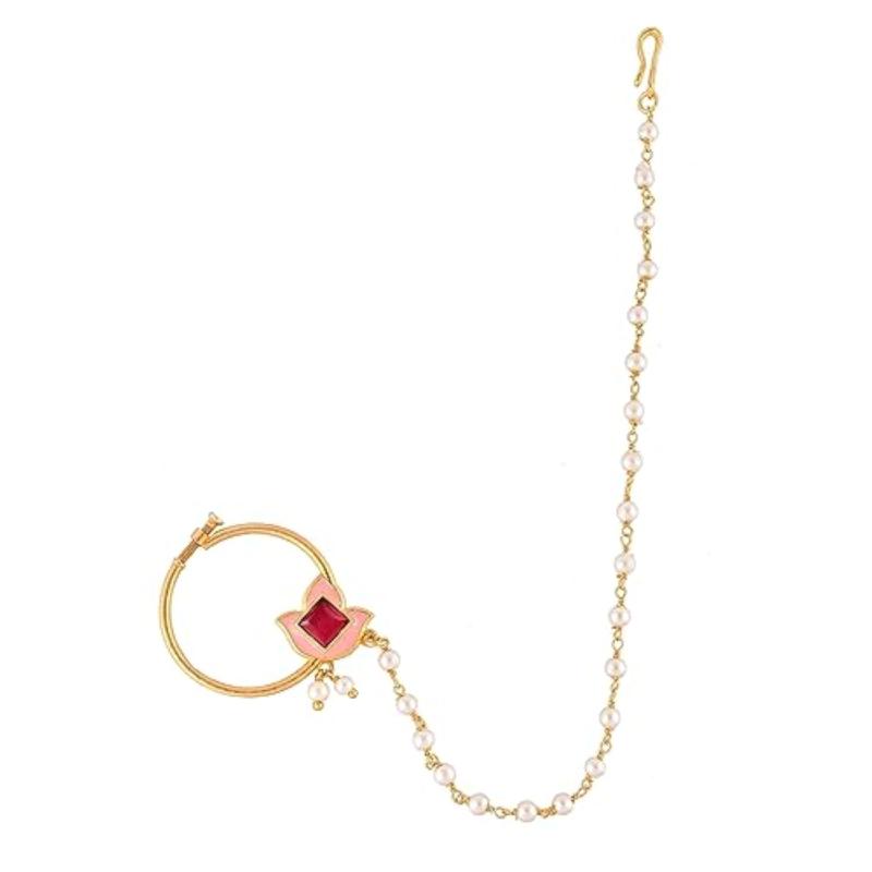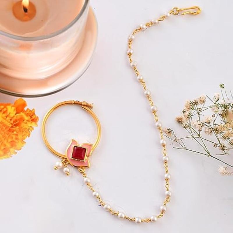 Make a stylish statement with this non-piercing nose ring featuring a floral motif and red stone. Perfect for adding a touch of elegance to your look.