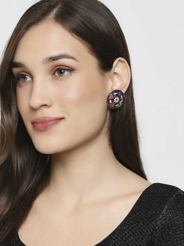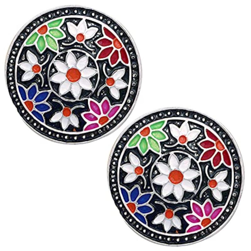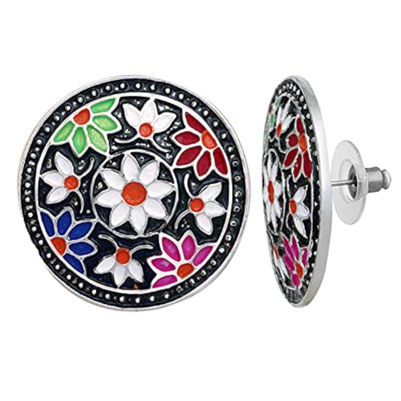 Elegant round shaped stud earrings featuring intricate Meenakari work enamelling with floral design. Perfect for adding a touch of traditional charm to any outfit.