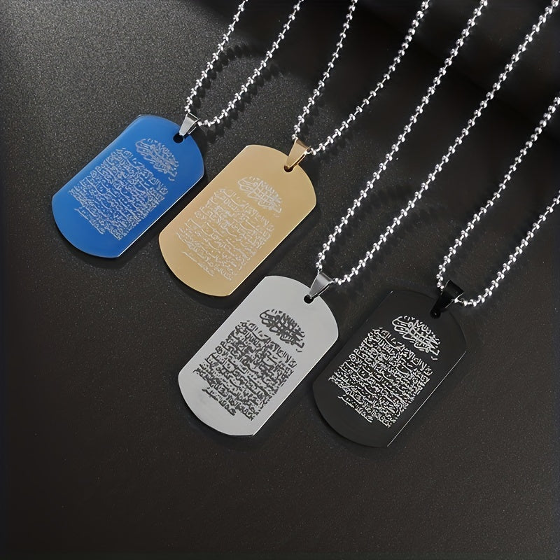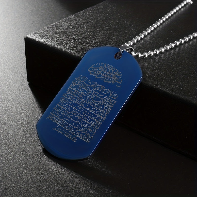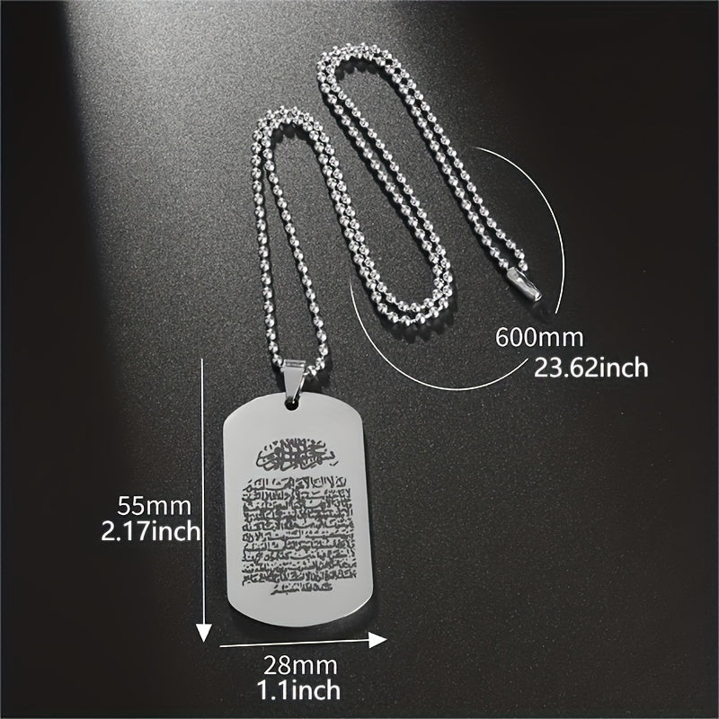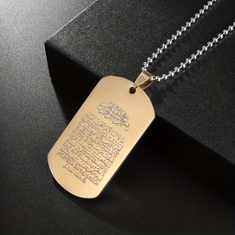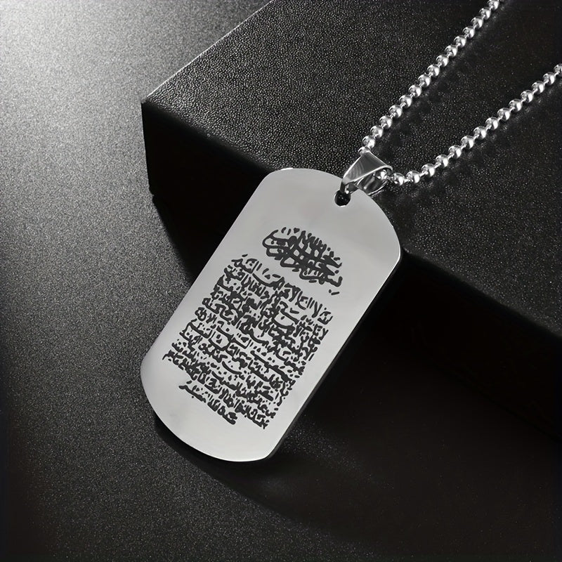 Stainless steel pendant necklace with Arabic scripture amulet design, perfect Muslim jewelry accessory for men.
