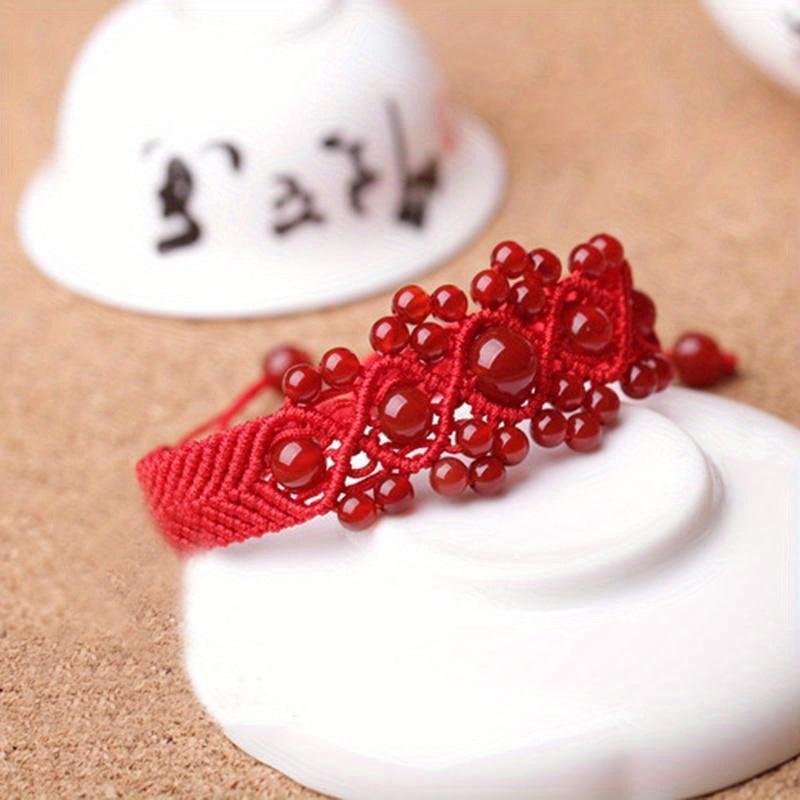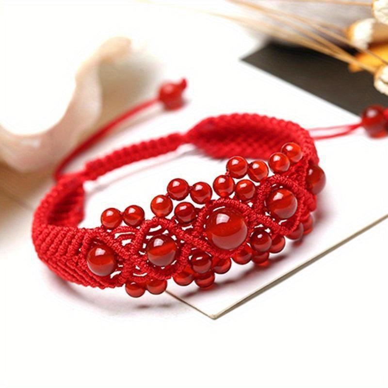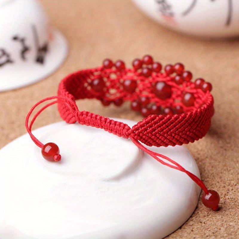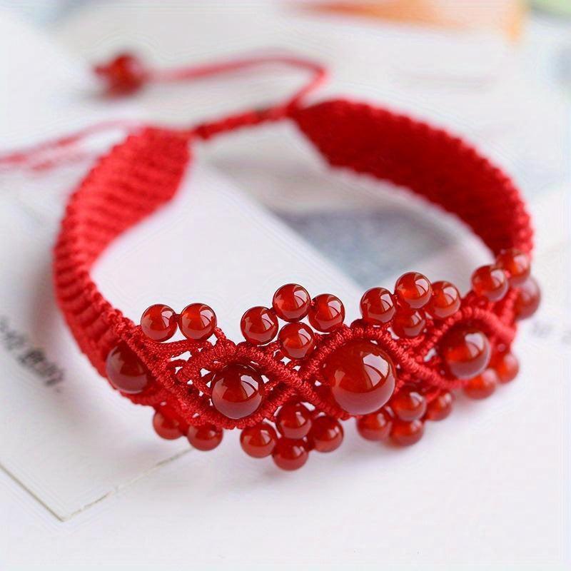 This stylish bracelet features natural red agate beads woven into a red rope, perfect for couples and friends. Great for girlfriends as a fashionable accessory.