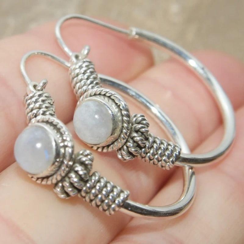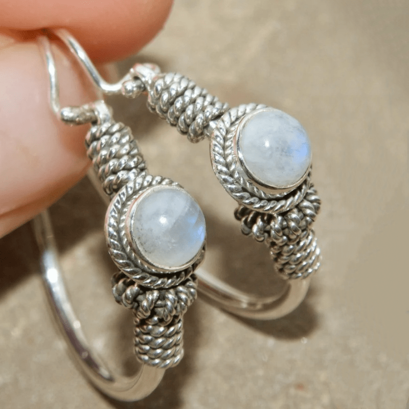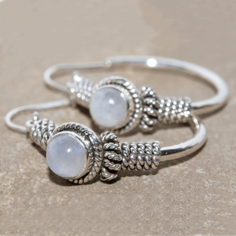 Add a touch of bohemian flair to your look with these stunning ethnic hoop earrings featuring rainbow moonstone.