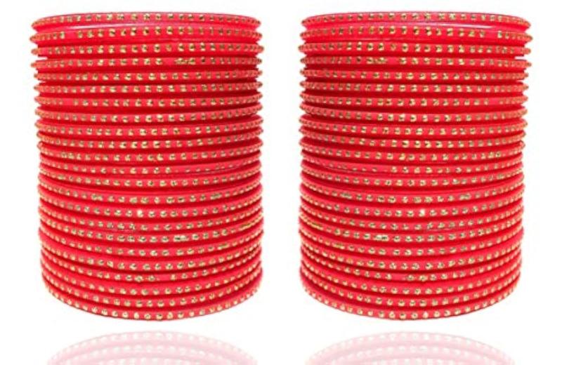 Enhance your traditional look with this set of 48 glass bangles featuring golden dots. Perfect for occasions or everyday wear.