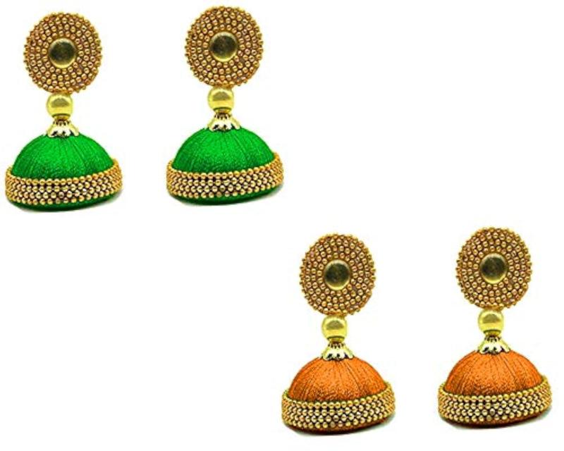 Add an ethnic touch to your outfit with these golden silk jhumki earrings featuring a silk dori design. Available in a variety of colors.