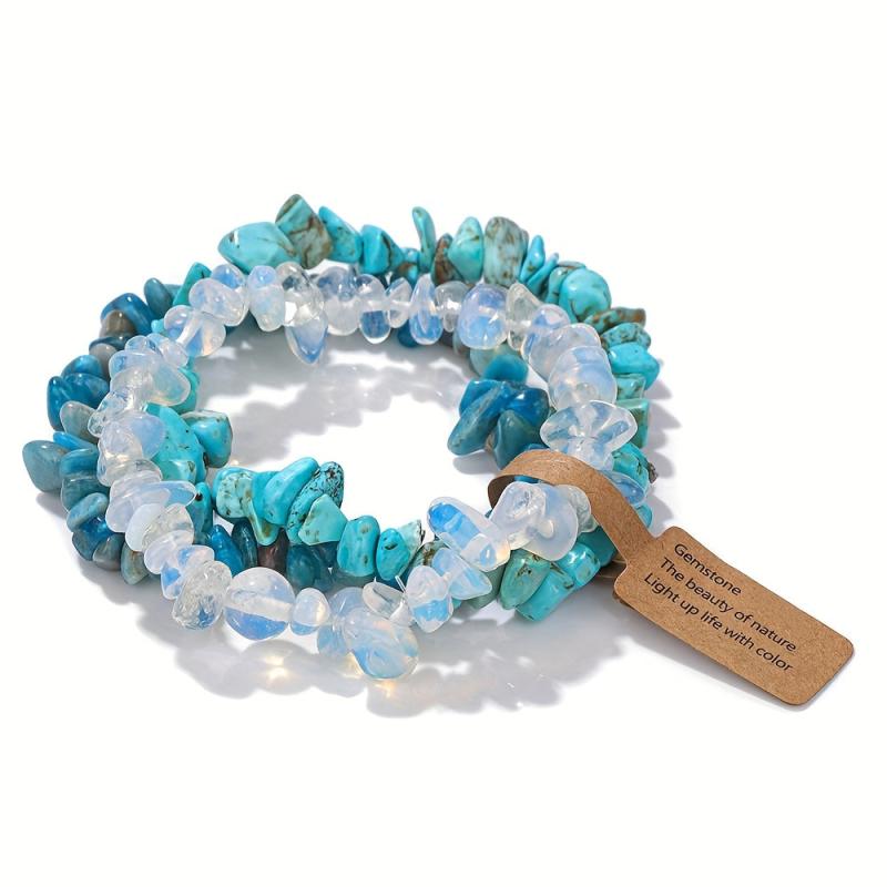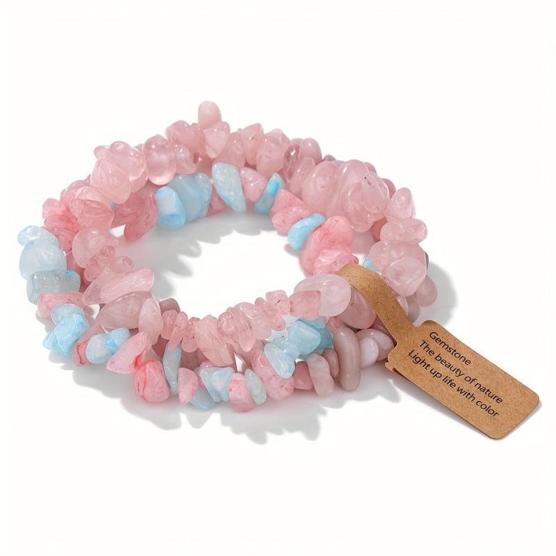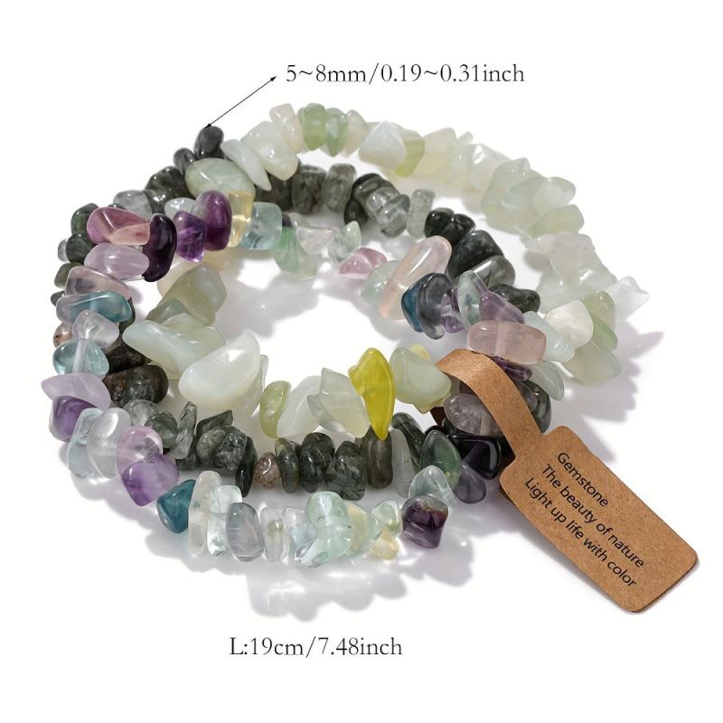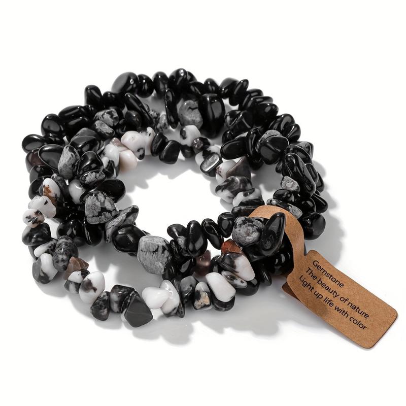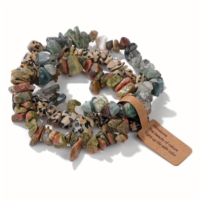 Stylish three-piece bracelet set featuring hot irregular gravel beads with a retro cow paper tag. Perfect for both men and women. Elastic for a comfortable fit.