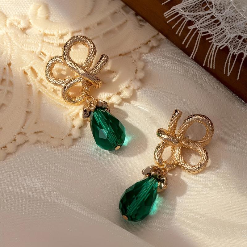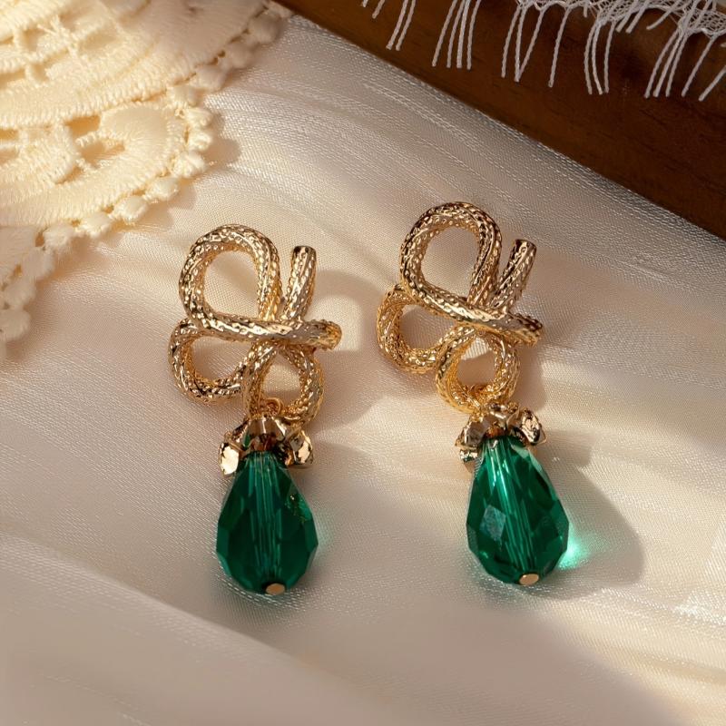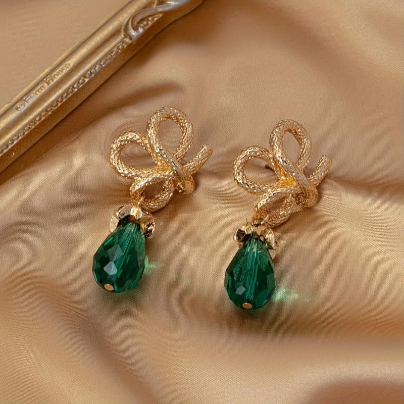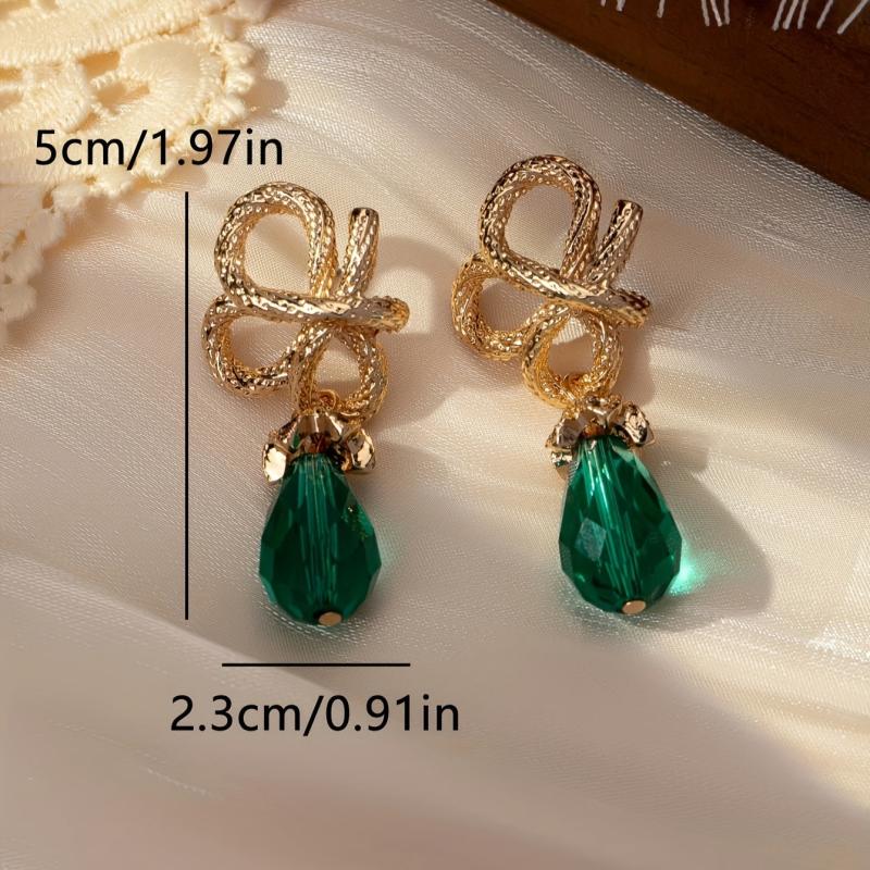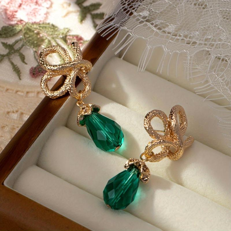 These gorgeous earrings feature a retro style with a golden plated finish and green glass decor. Perfect for daily wear or special occasions.
