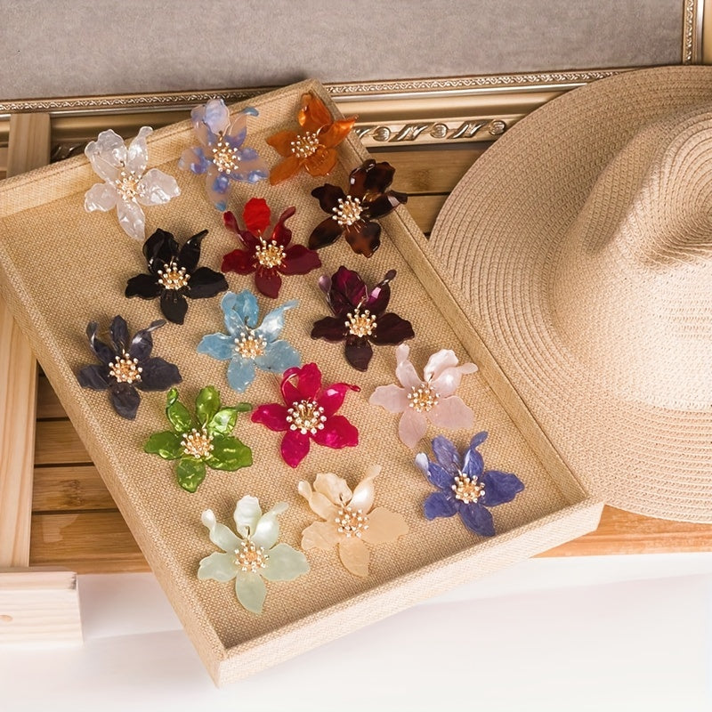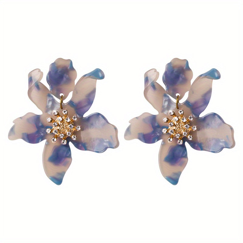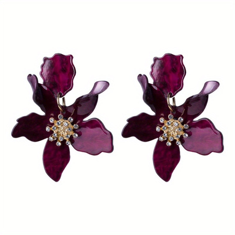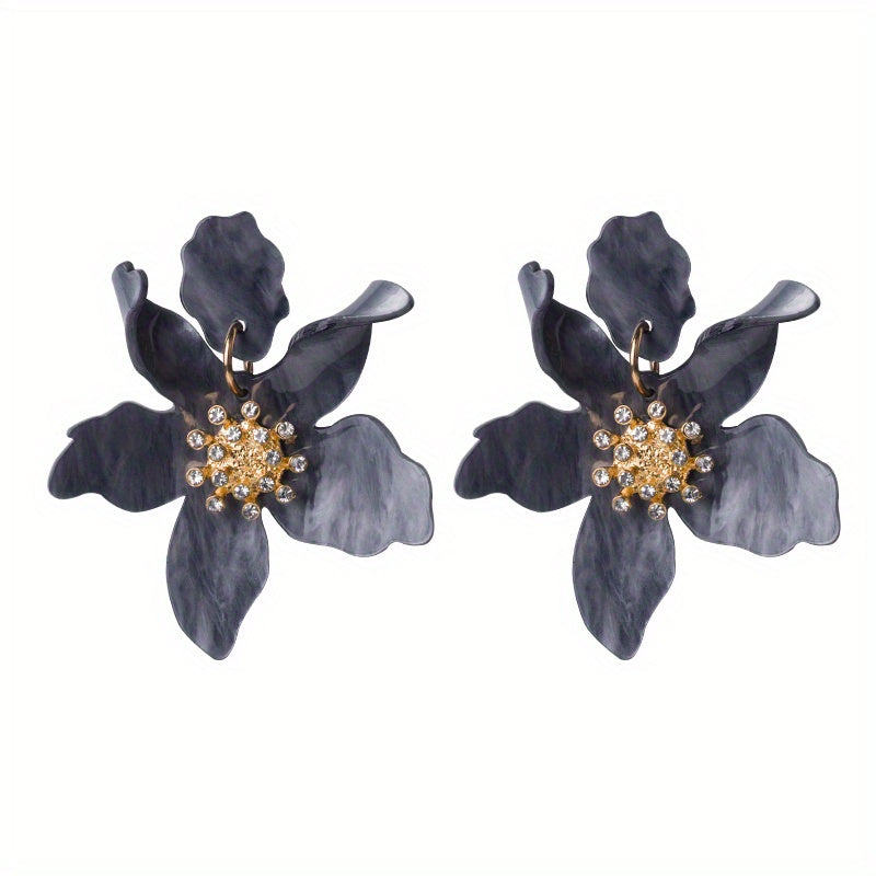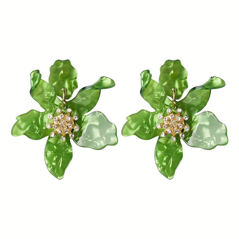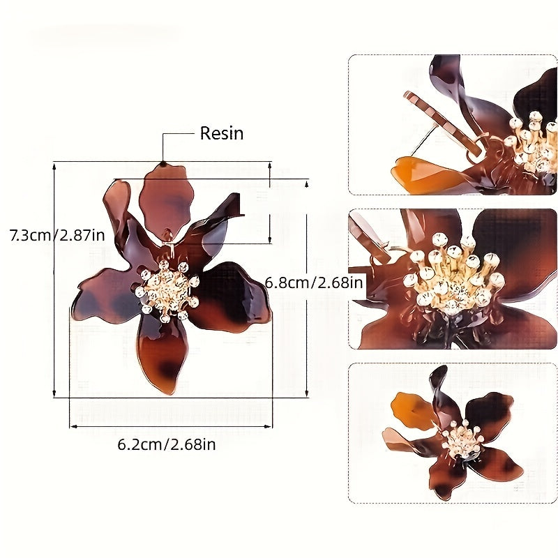 Glamorous resin earrings featuring a bold flower design with sparkling synthetic gems. Perfect for special occasions and adding a touch of elegance to your outfit.