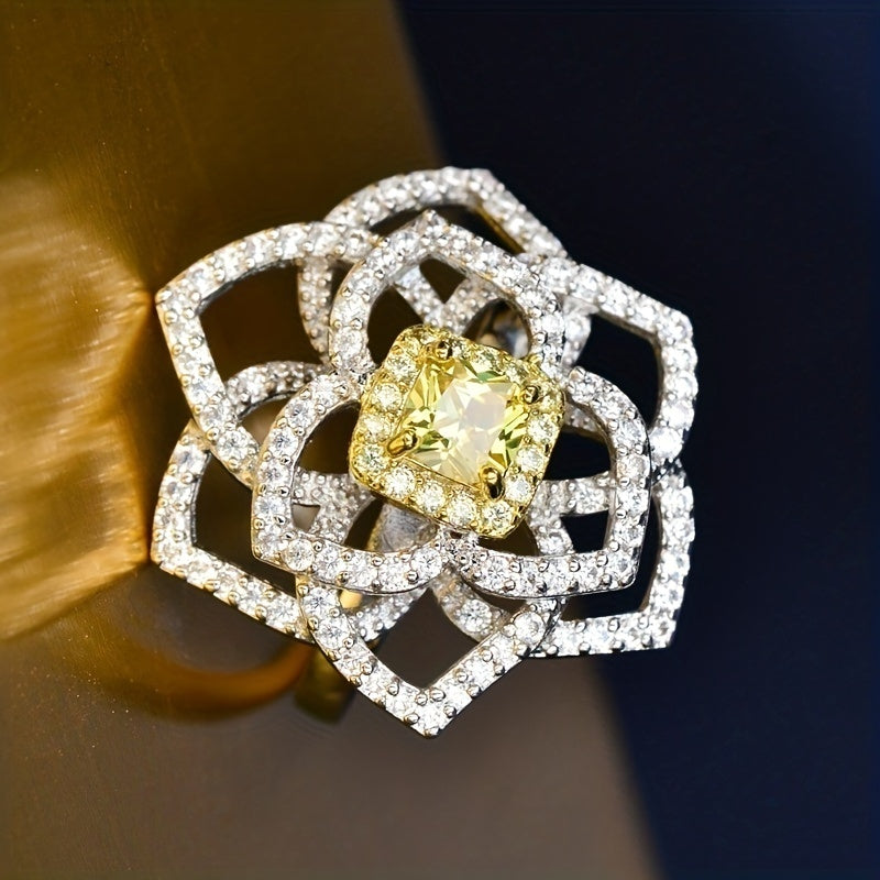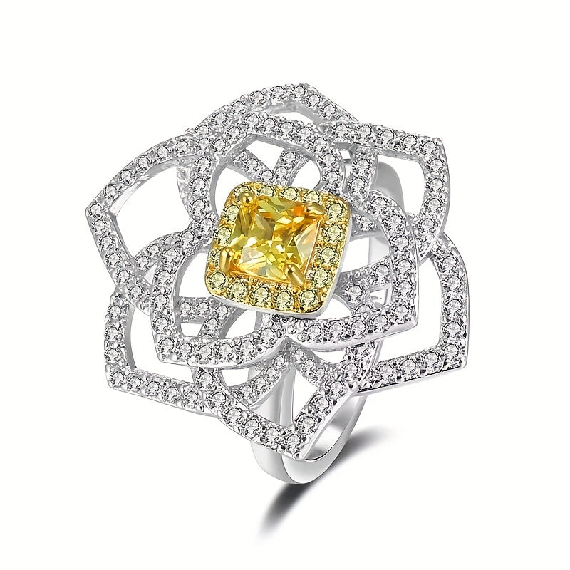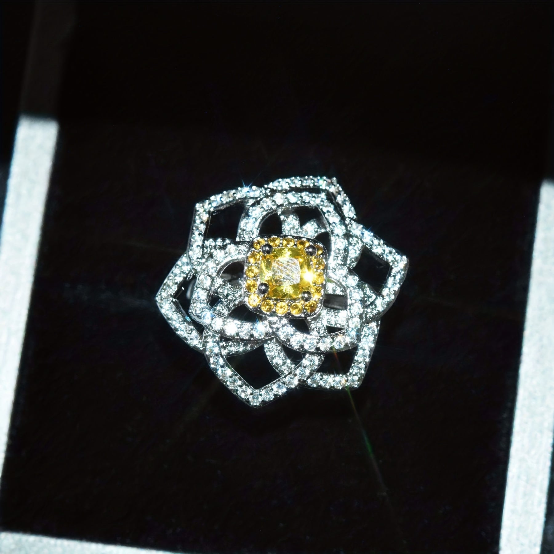 Make a statement with this elegant flower ring featuring intricate rhinestone inlay design. Perfect for matching with evening party outfits, this dainty ring is a symbol of elegance and beauty. Makes a great birthday gift.