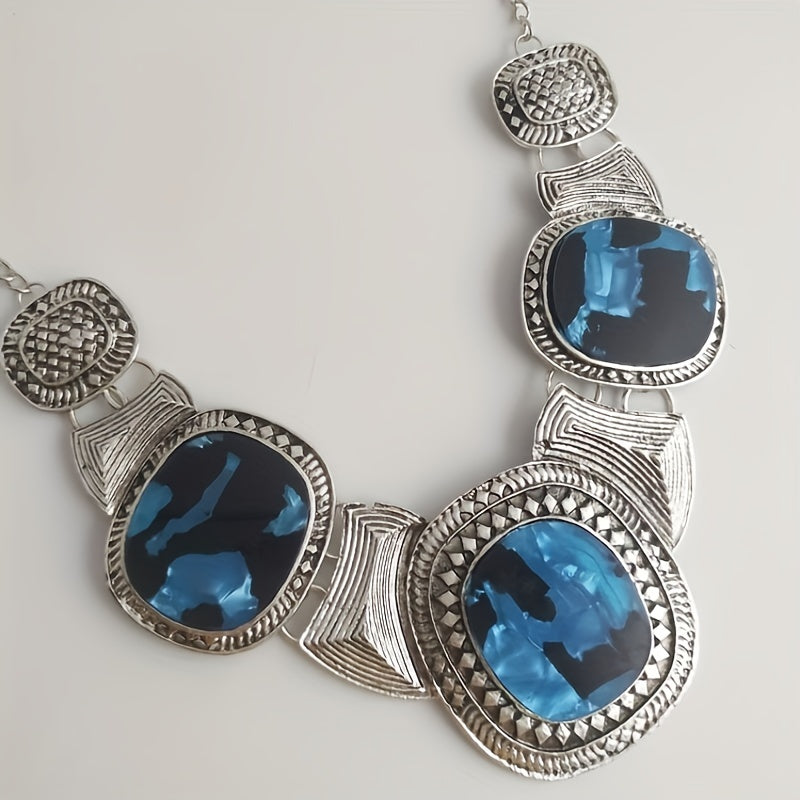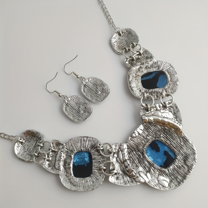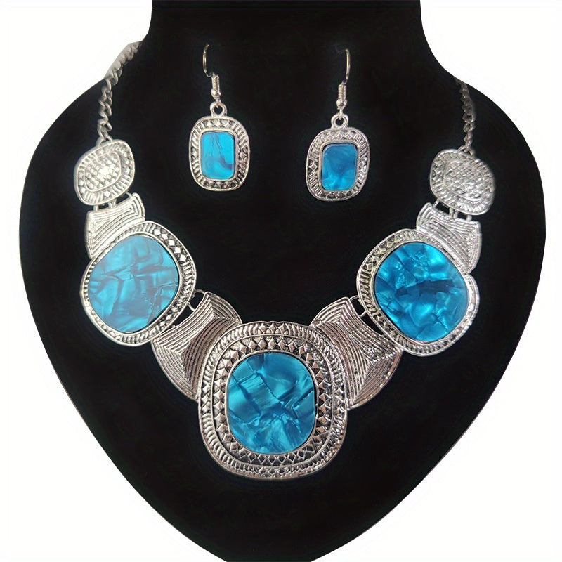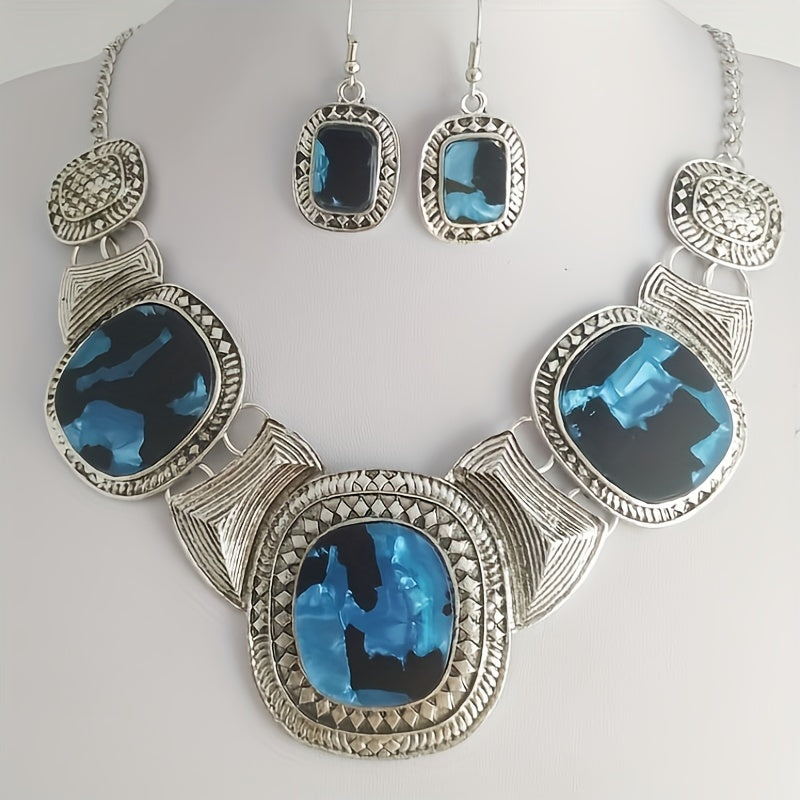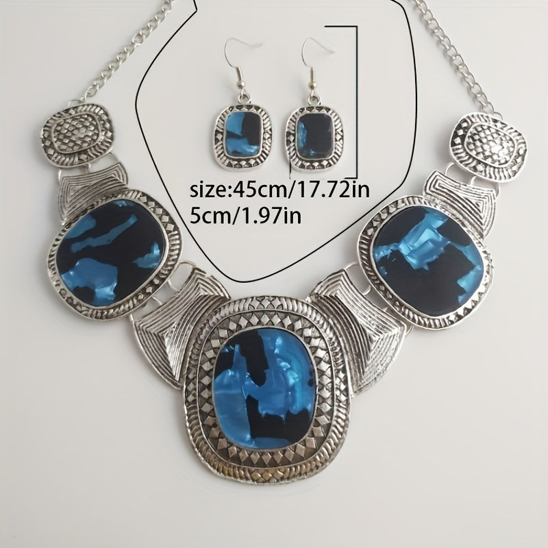 Make a statement with this stunning jewelry set featuring large gemstone inlays. Perfect for evening parties or as a birthday gift for someone special.