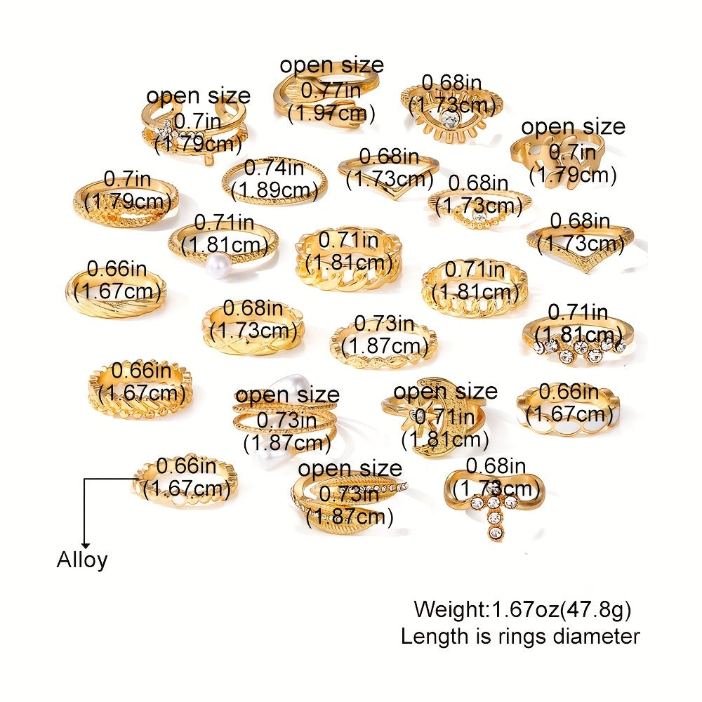 This striking ring set features a variety of unique designs, including a cross, devil's eye, and more. Inlaid with sparkling rhinestones, these rings make a bold fashion statement.