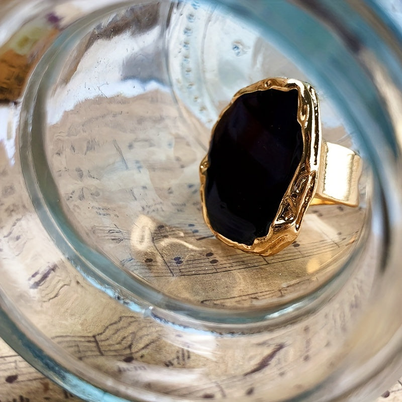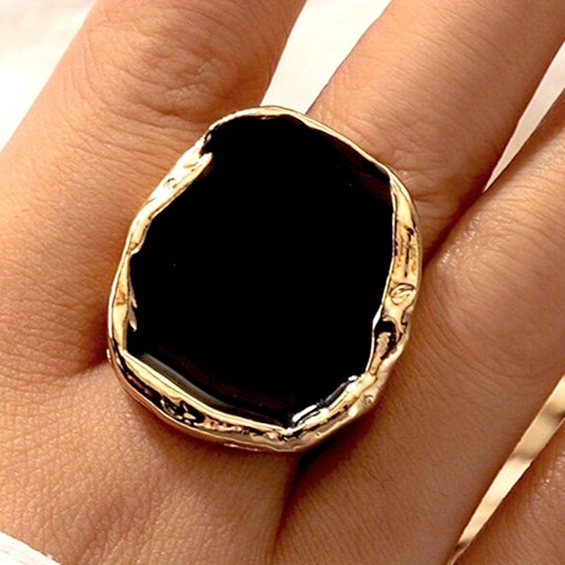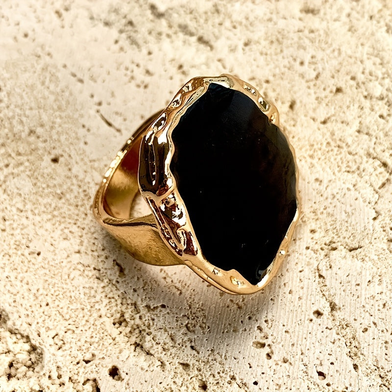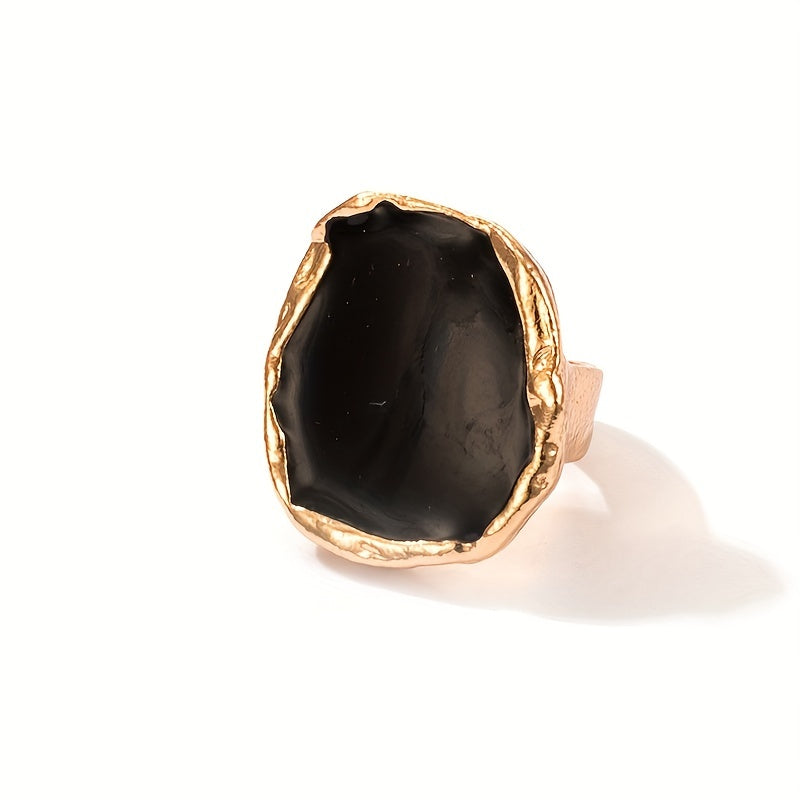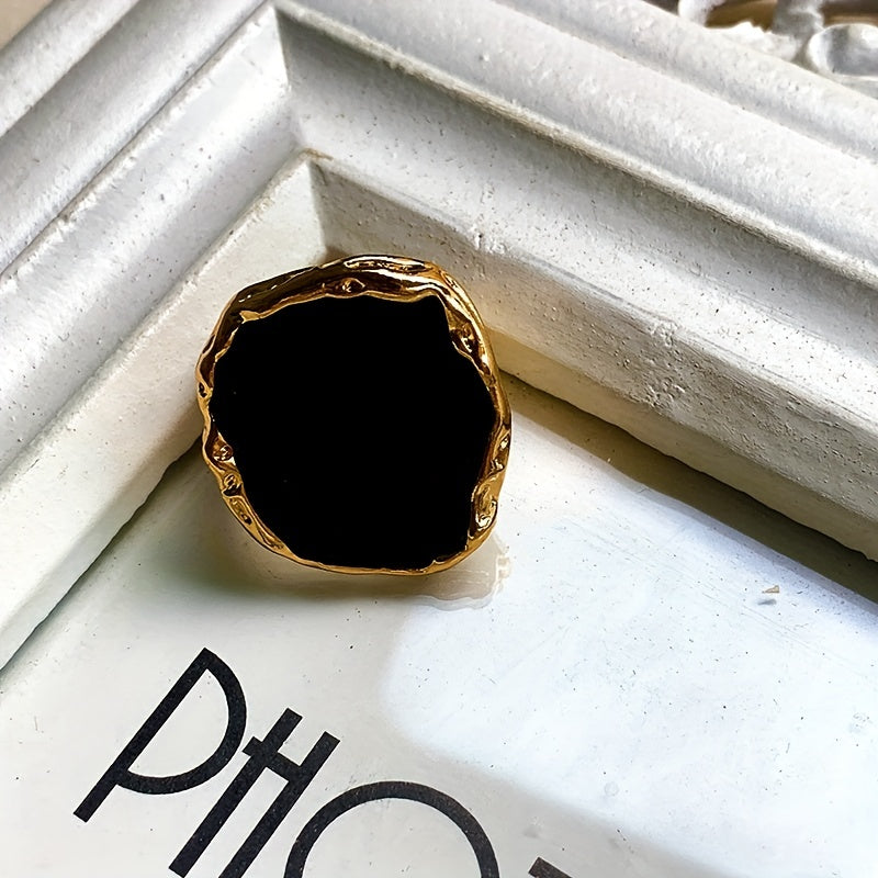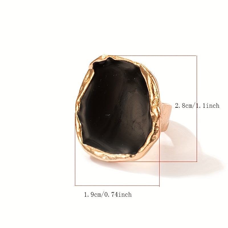 This unique ring features an exaggerated design with an irregular shape and golden edging, perfect for making a statement.