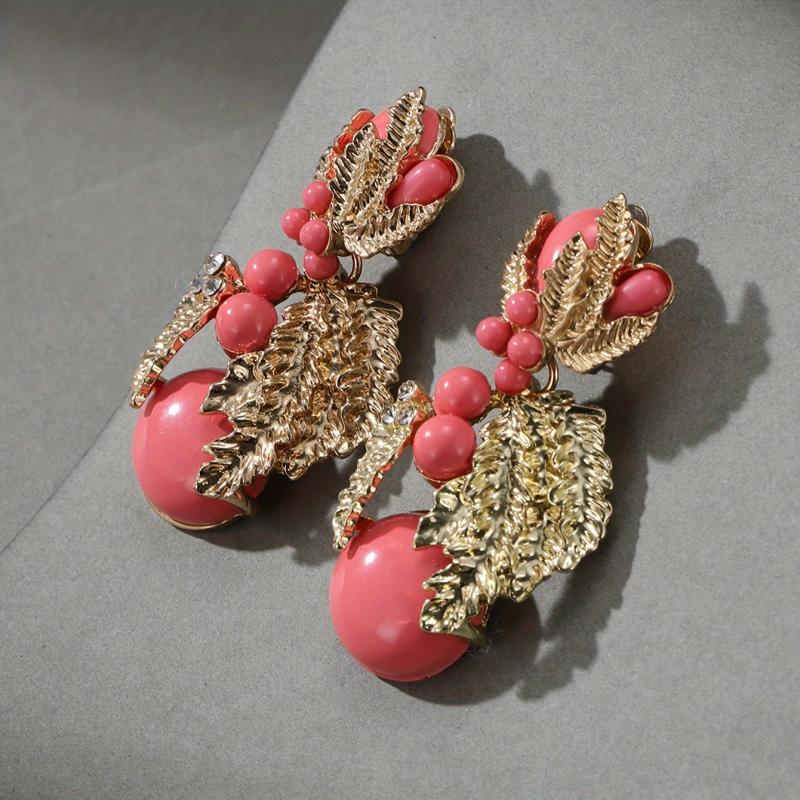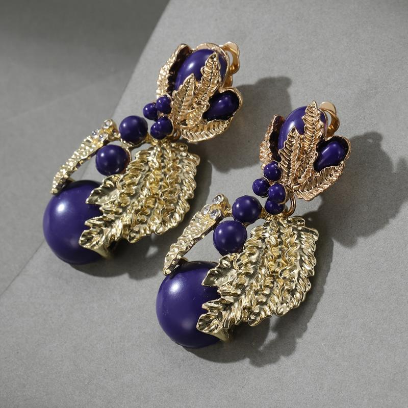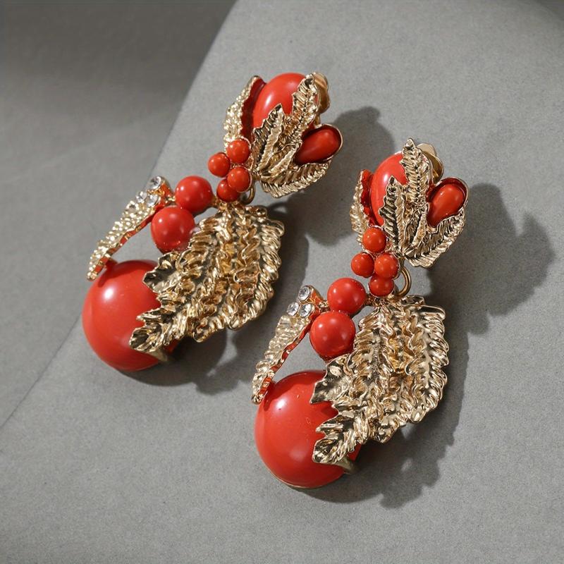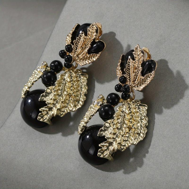Vintage style clip-on earrings featuring resin beads and golden leaf design. Perfect for women to wear at banquets or other special occasions.