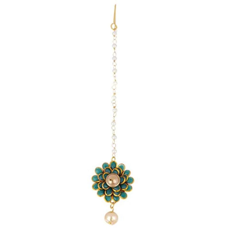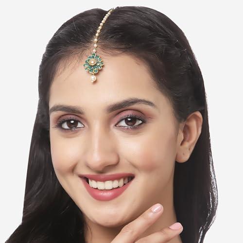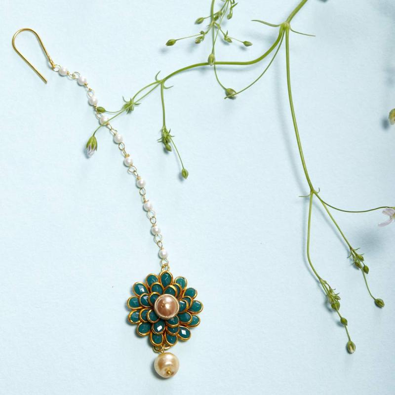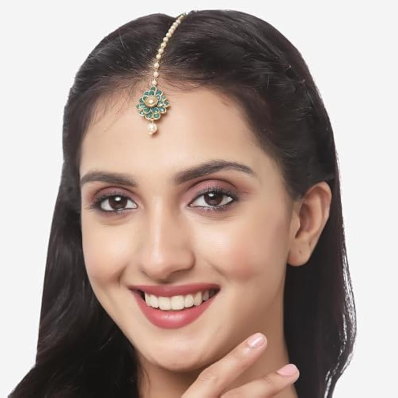 Elegant and stylish maang tikka with intricate flower design, plated for a luxurious look.