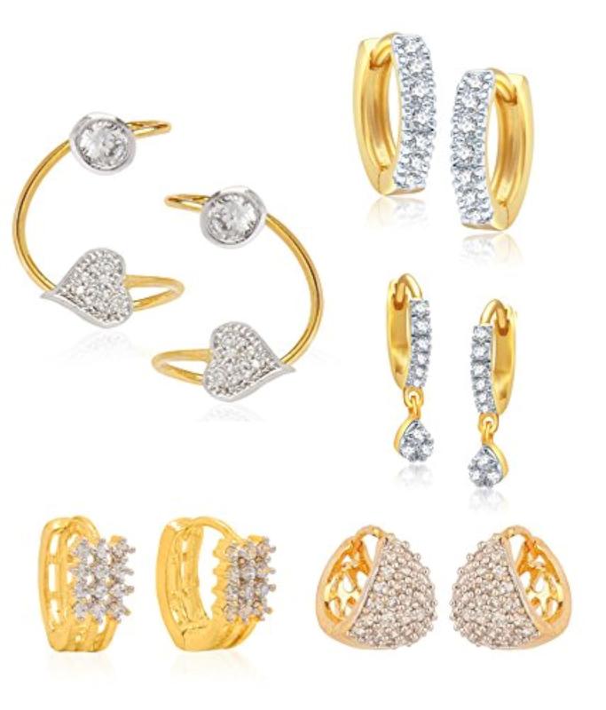 Elevate your style with this stunning combo of 5 fancy AD earrings featuring heart earcuffs. Perfect for adding a touch of glamour to any outfit.