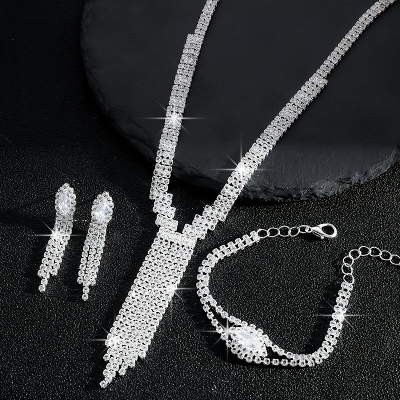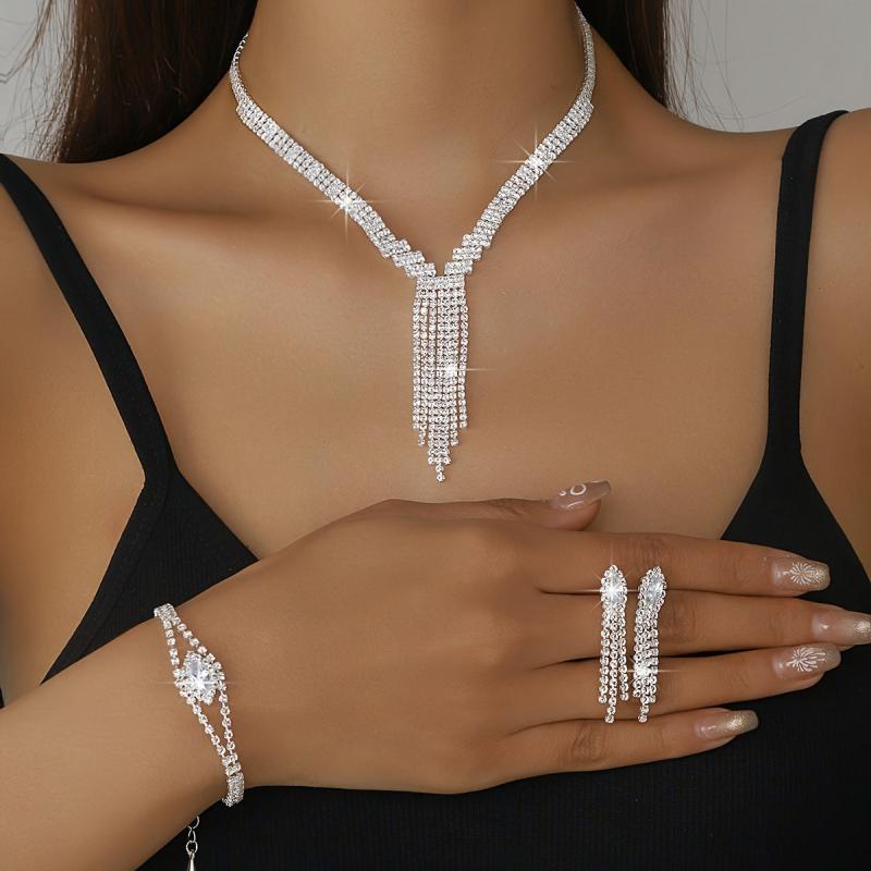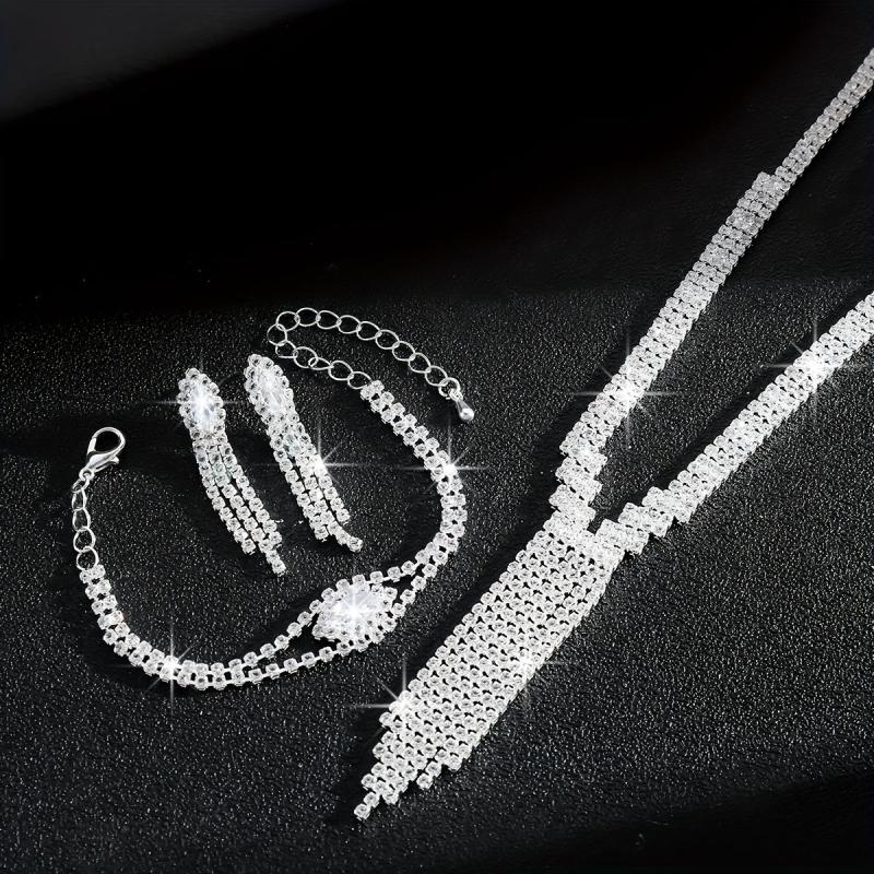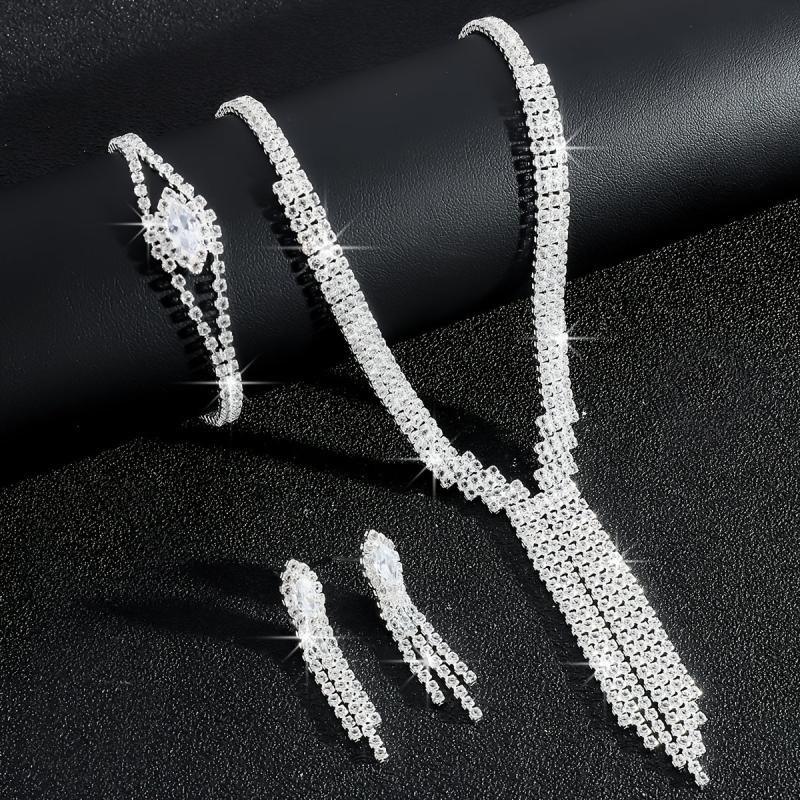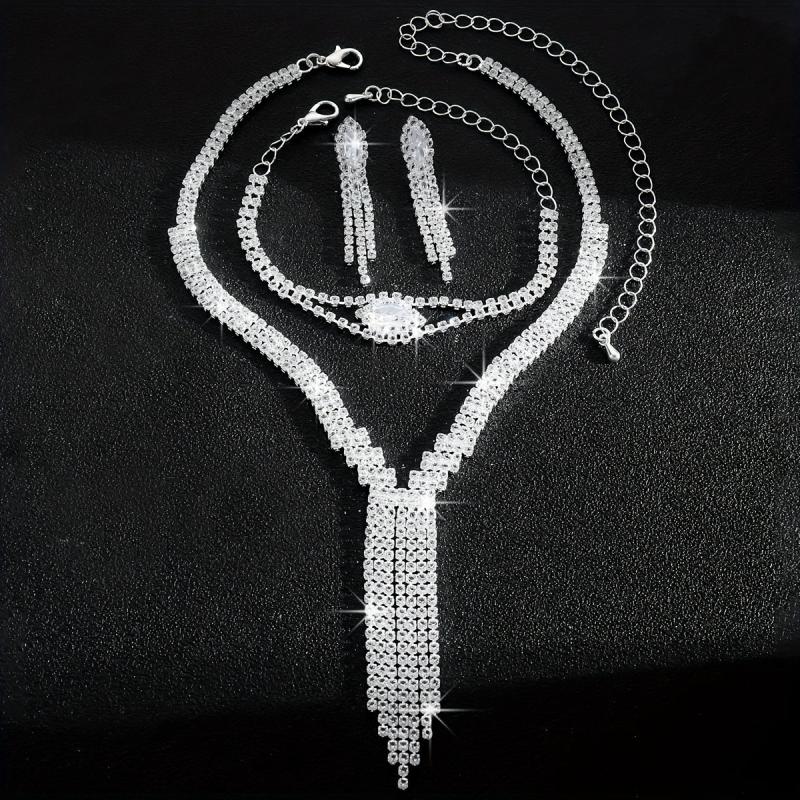 Elevate your style with this three-piece set of fashionable jewelry that includes a necklace, bracelet, and earrings featuring sparkling rhinestone tassels. Perfect for music parties!