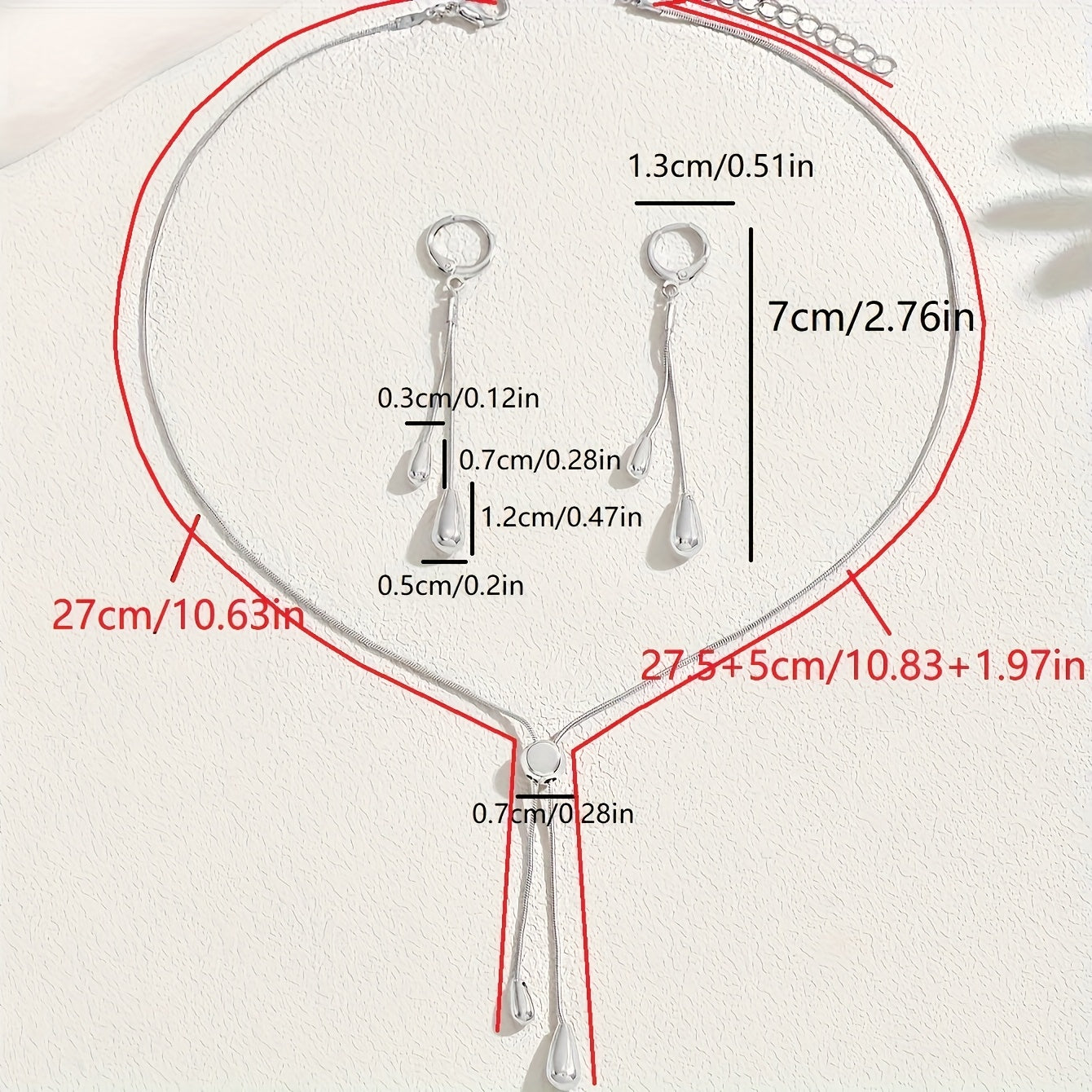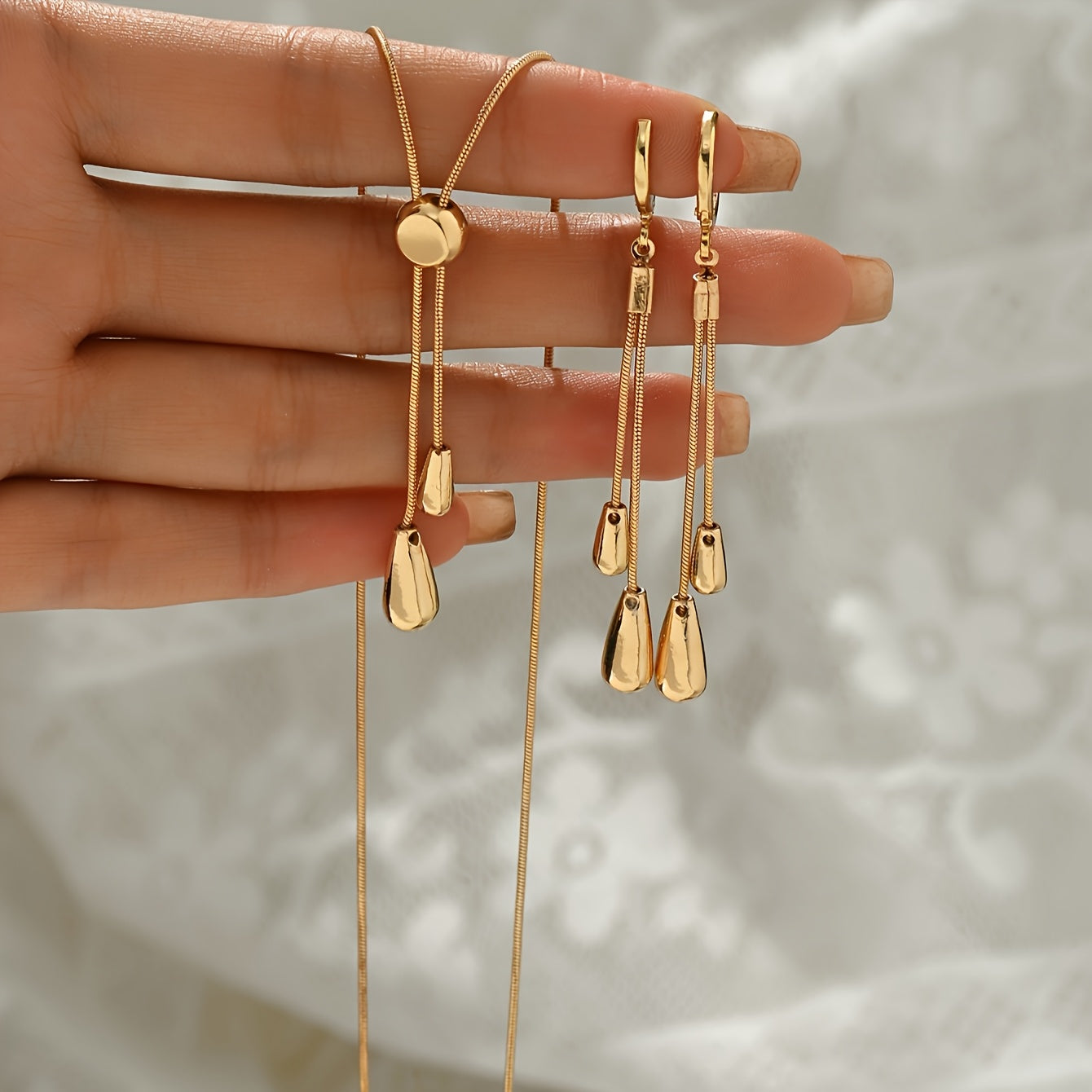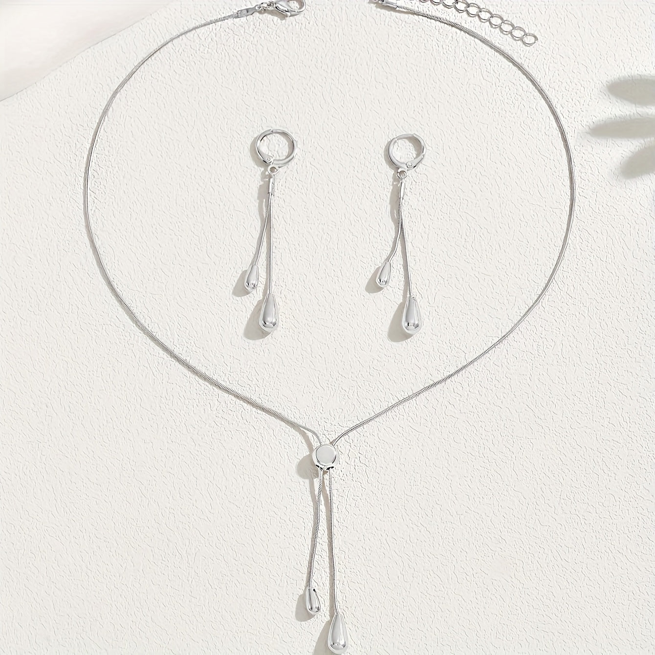 This set includes an adjustable chain pendant necklace and earrings. The necklace features a snake bone thin chain with a drop design. Perfect for adding style to any outfit.