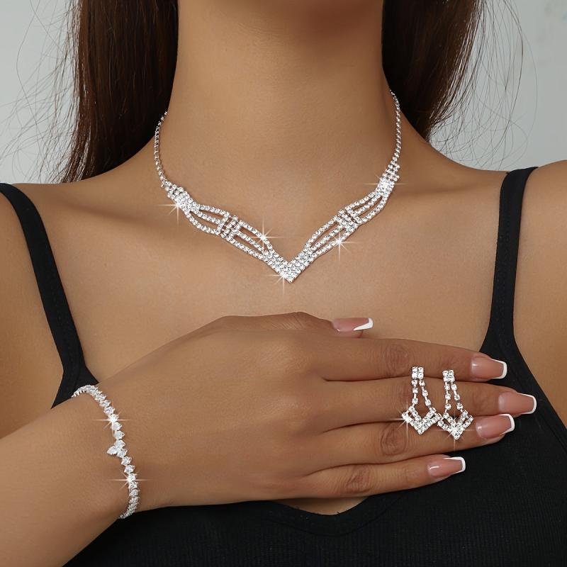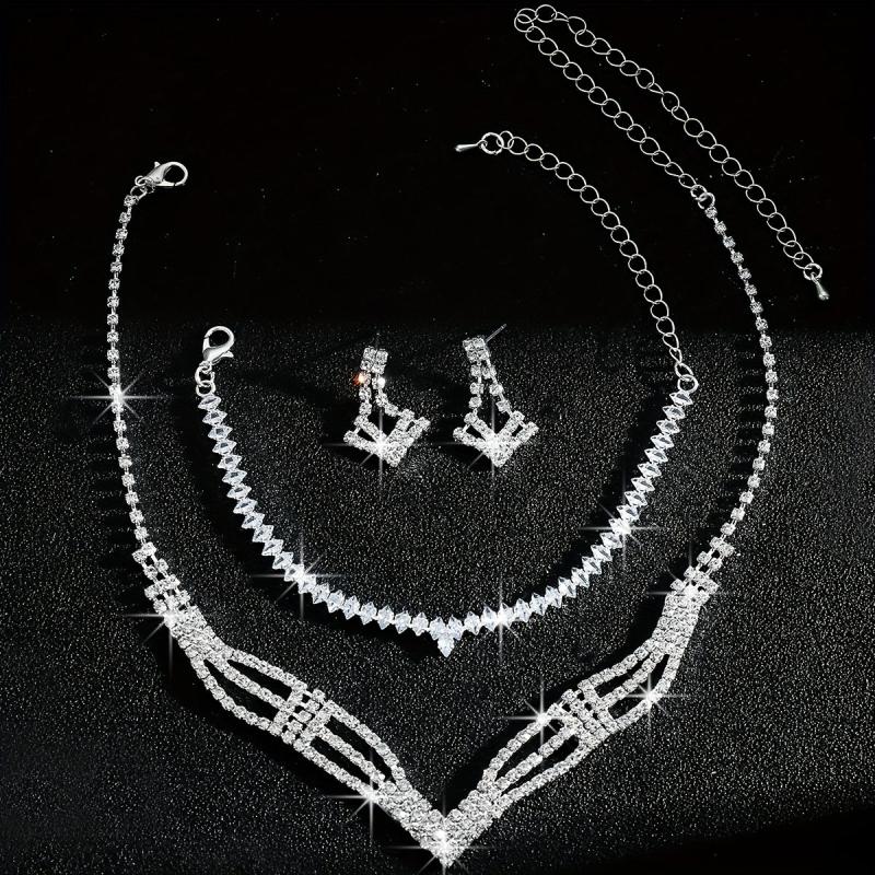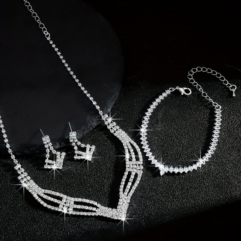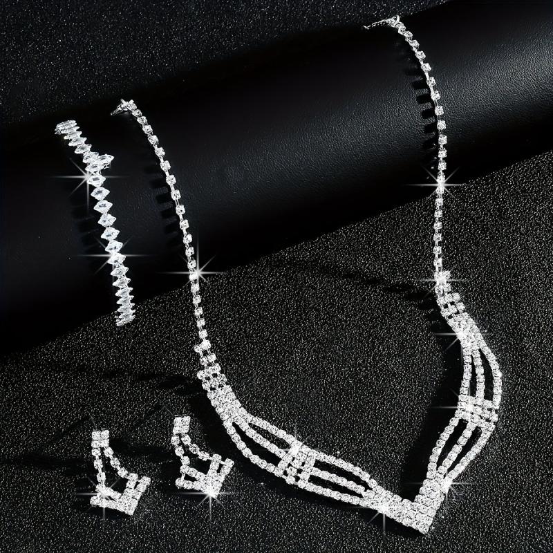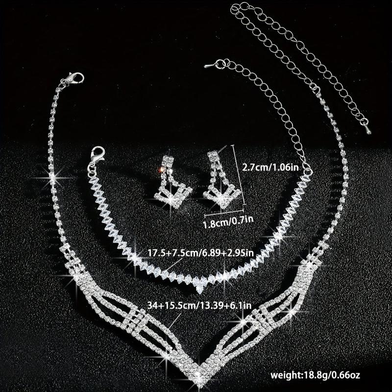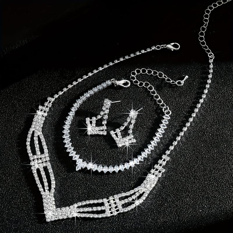 Elevate your bridal look with this stunning rhinestone necklace, bracelet, and earrings set. The high-end style and intricate geometric design will make you shine on your special day.