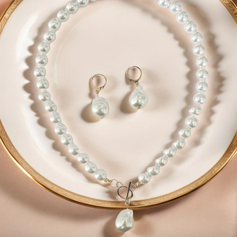 Elegant pearl jewelry set featuring round and baroque faux pearls with a golden tone clasp pendant, perfect for parties and special occasions.